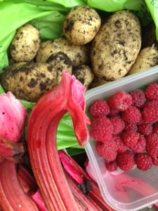 I arrived at the plot on Saturday to find the bindweed making a bid for world domination and slug chewed dahlias but on the up-side, the most amazing armfuls of roses, fat stems of red rhubarb, first earlies just ready and raspberries waiting to be sampled.