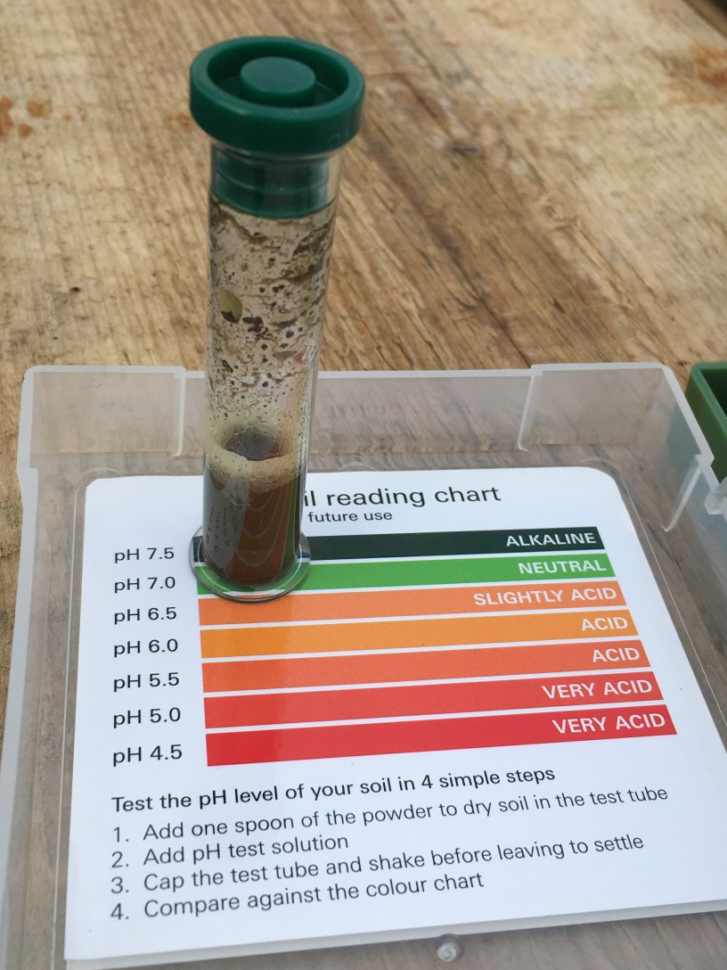 I assembled by test tubes, added the powder, then the liquid, shook vigorously and left to settle and then colour matched against the Ph chart. It seems liming won’t be necessary!