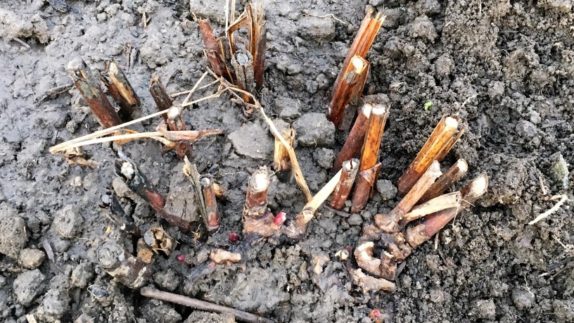 I tend to leave the old growth in place until March – as a marker and a little frost protection for the new buds. I cut back all the old growth to reveal the buds. The aim is to have 3 buds per division.