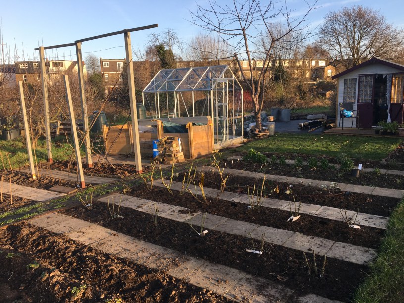 Here’s plot 48 after 10 months, around half the plot has been tamed and organised. I’ve been able to move the pear and apple trees, roses and peonies from plot 34.