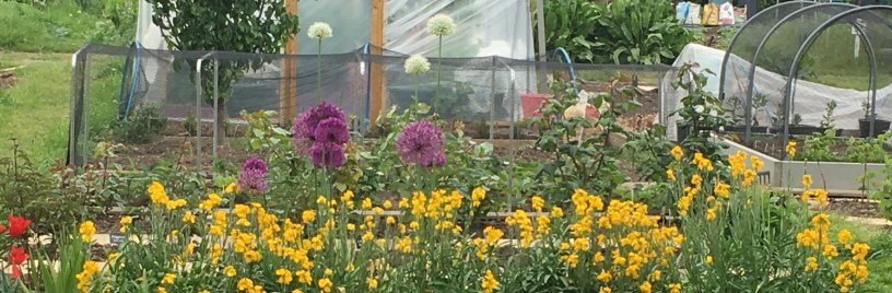 First up is the long view down the plot, from the wendy shed. The wallflowers have flowered non-stop since mid-March and the bees love them. The tulips are mostly finished; the red ones to the far left have been going for about three weeks, so I’ll forgive them for not being the Darwin hybrid Apeldoorn’s. The alliums are now centre-stage and attracting numerous pollinators.