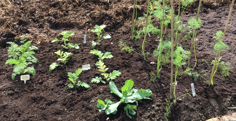 I’ve grown them from seed, potted them on and hardened them off. The chrysanth’s leaves are yellowing from being in a pot too long – so out they went. Their flower partners are Ammi visnage, Bells of Ireland, Cerinthe and Ridolfia Goldspray. This bed will soon be filled with dahlias, scabious and cosmos – these are in various stages of getting ready to leave the greenhouse or sitting on the hardening off table.