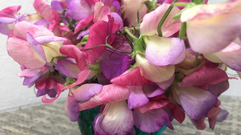 A little posy in a jade green milk jug. These were grown from saved seeds and of course, the name has been lost! If anyone recognises the variety, please let me know. In the meantime, I’ll carry on enjoying the fragrance.