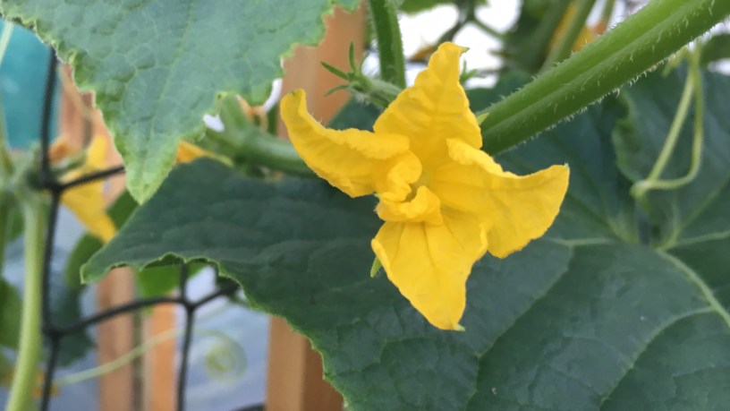 The cucumbers and melons have almost identical flowers – hardly surprising as they come from the same family.