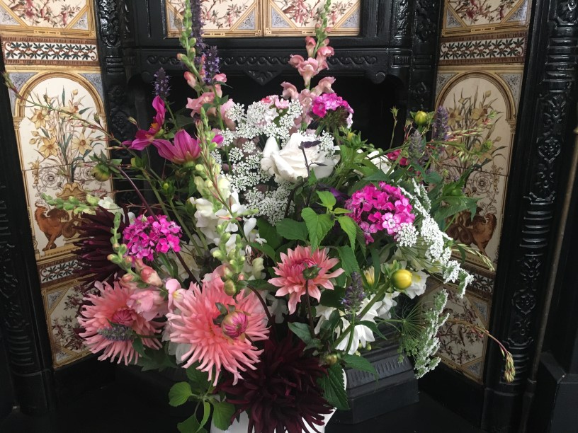 My goodness, you what an abundant delight! And of course it is much harder to restrict yourself to something simple when you have such a lot of blooms at your disposal – I know I had to restrain my itchy fingers this week to stick with just the three dahlias. It looked a very grand setting until I realised it was a fireplace, which in fact is a perfect place for an elaborate display like this. Thanks so much for joining us