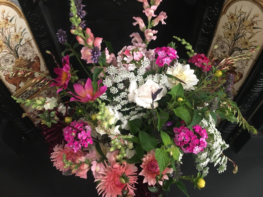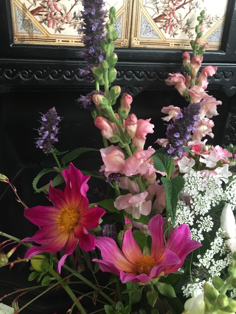 This week’s offering is an assortments of flowers just starting (dahlias) and those elegantly going over (agastache). I’ve grown dianthus kaleidoscope for the first time and I think well worth the effort of the over-wintering and pinch-out malarkey – they smell lovely and last forever in and out of the vase.