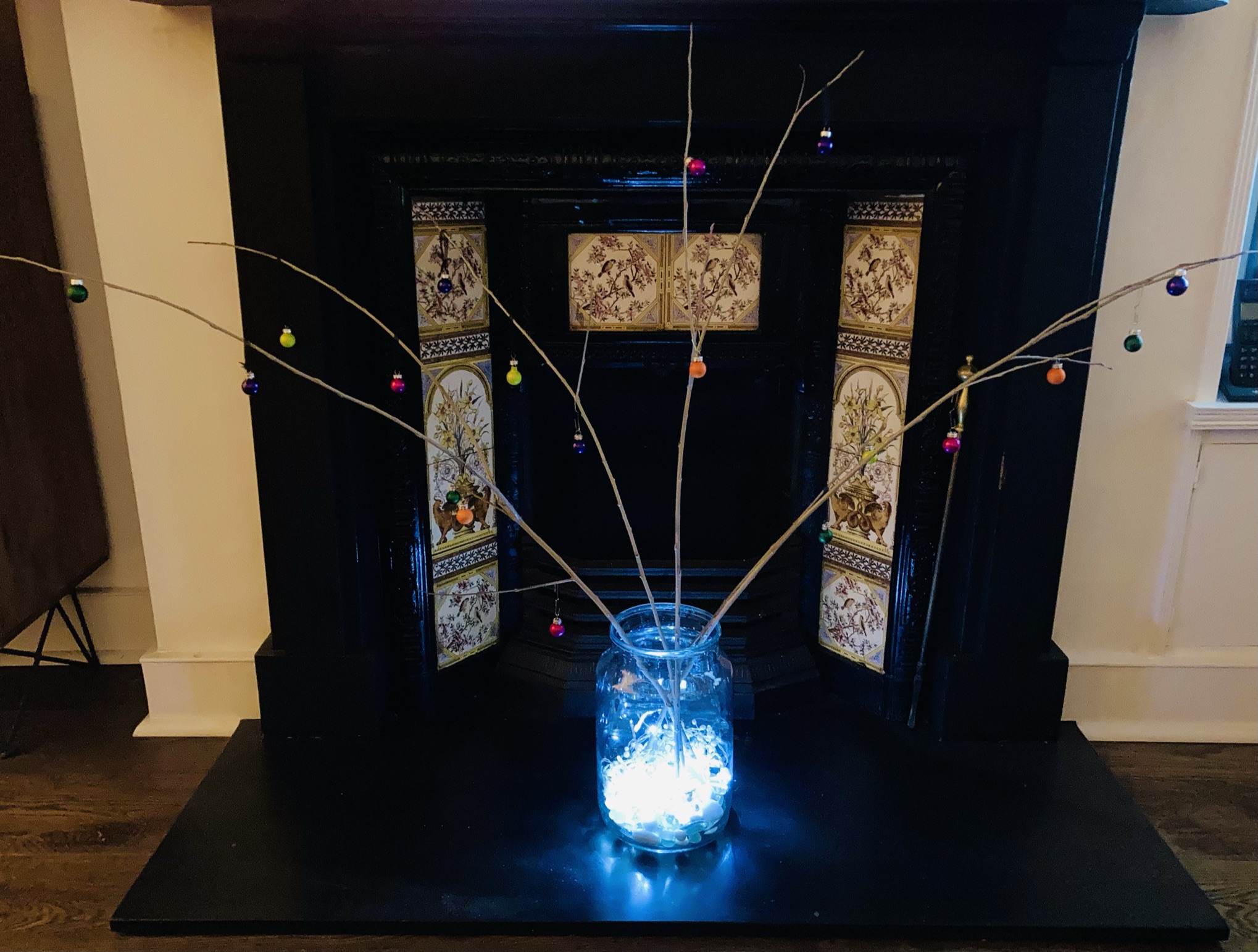 I’m going to be spending my week off between Christmas and New Year organising the house, emptying the loft and packing boxes ready for our move in February (fingers crossed) With all of that going on, I didn’t want the faff of taking down and packing away the Christmas tree but I didn’t want to be a complete grinch either. So since the scandi, pared down look is on trend……off I went in search of some suitable branches. I sprayed them grey and added bright mini baubles. I arranged them in a vase on the hearth with white pebbles, glass beads and a string of lights (more stuff to pack away) I was pleased with the result.