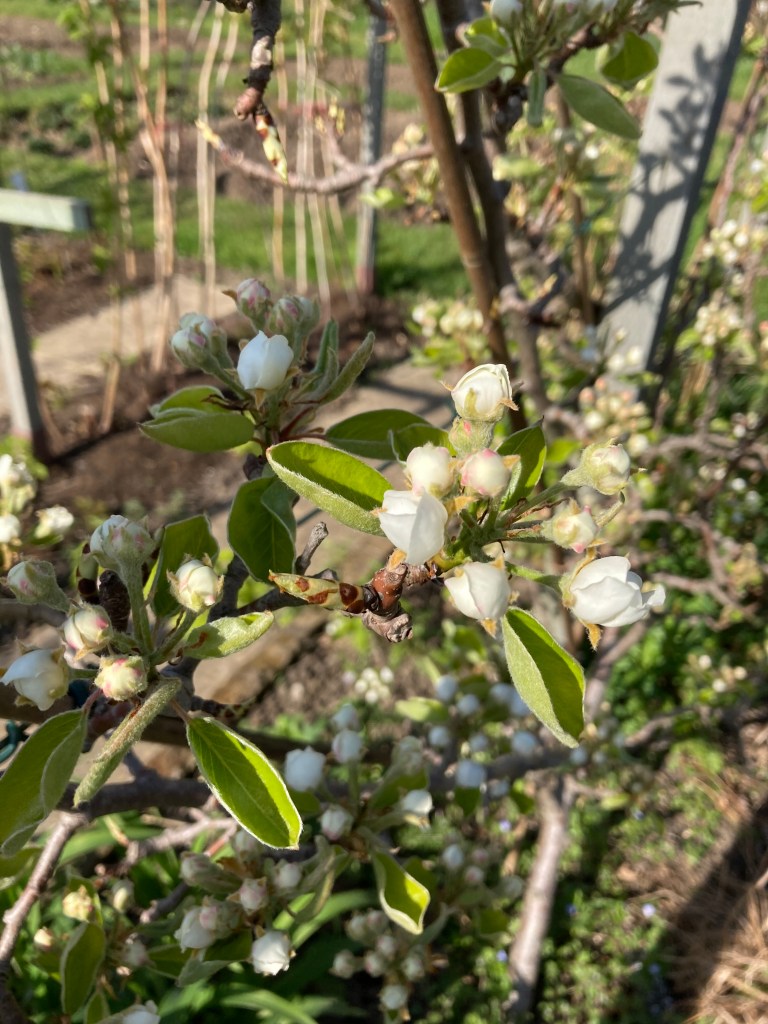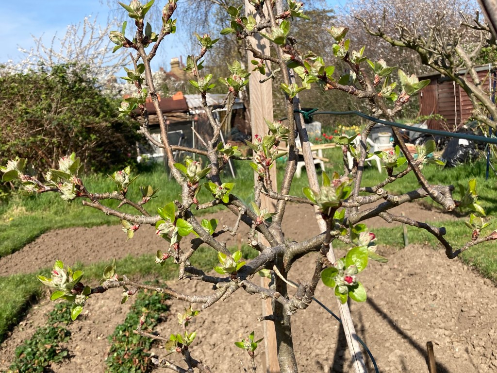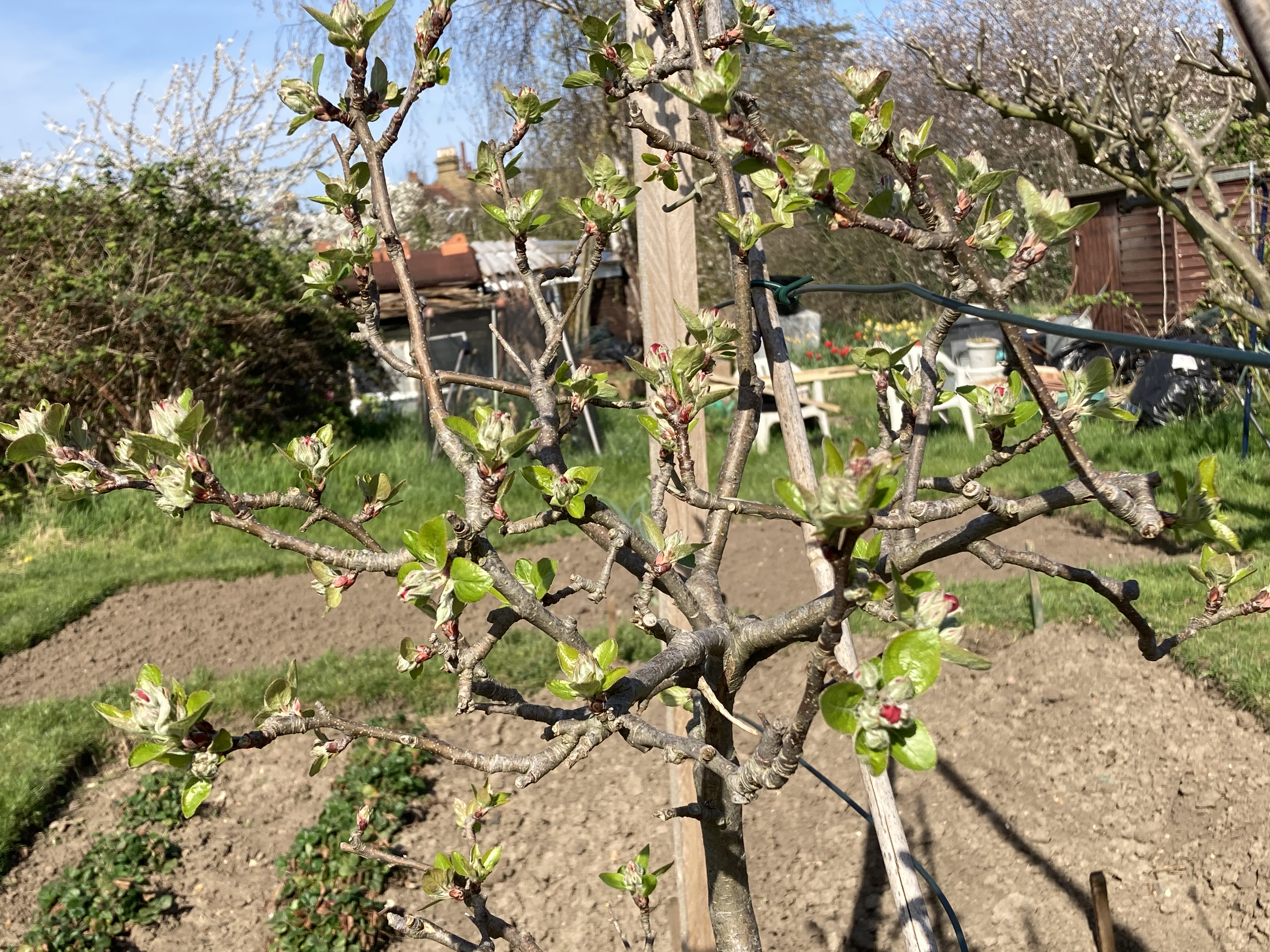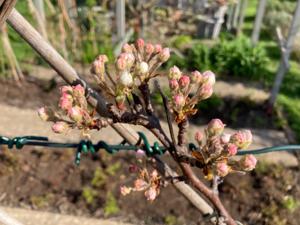 Let’s start with the fruit tree blossom. The cover photo is the conference pear which had a very late (January) pruning. I used the cut branches as support for the peas in the polytunnel about a week later. I didn’t expect the blossom on those branches to continue to open but they have. The rest of the blossom is where I’d expect it to be – still attached to the trees.