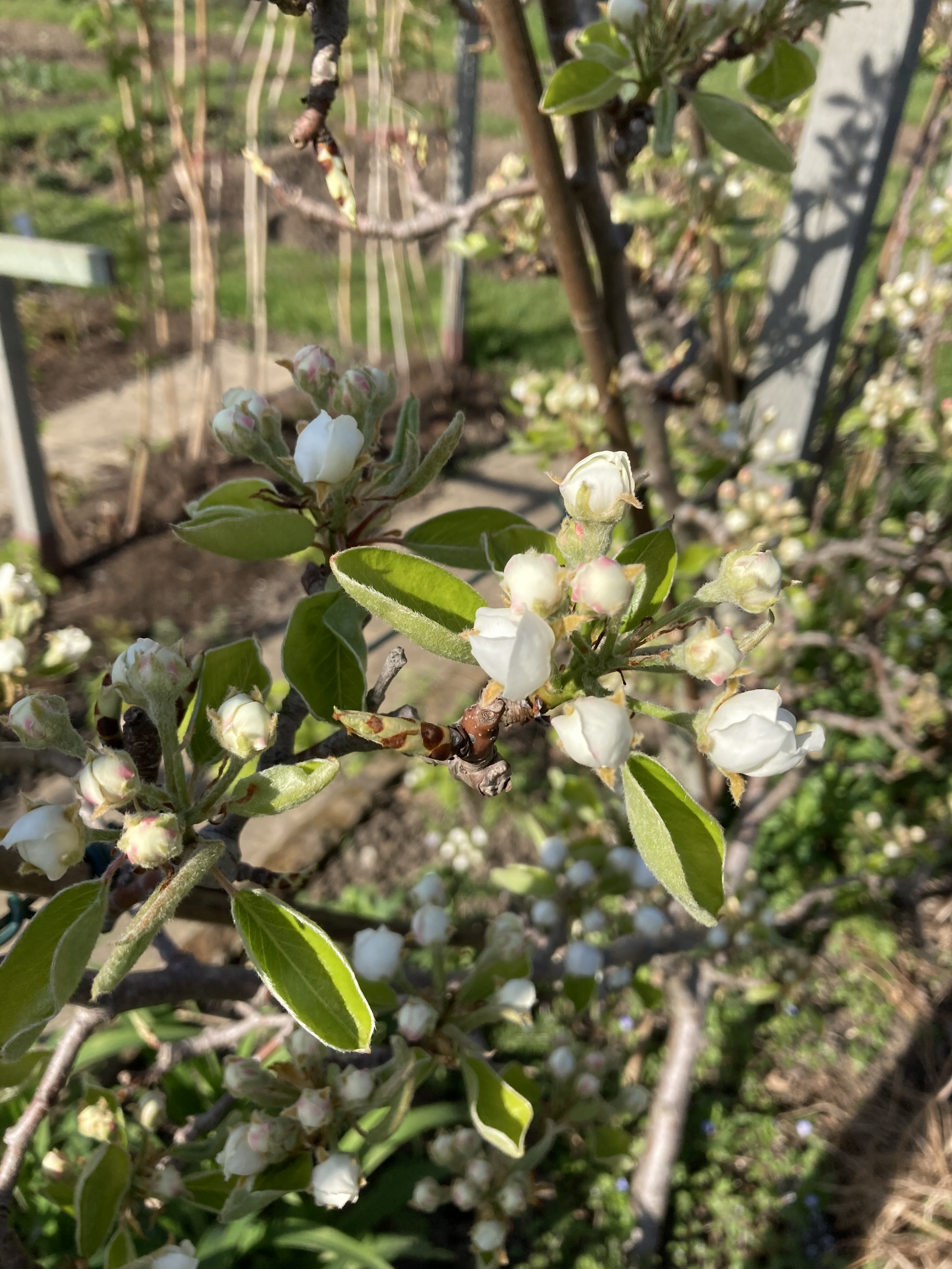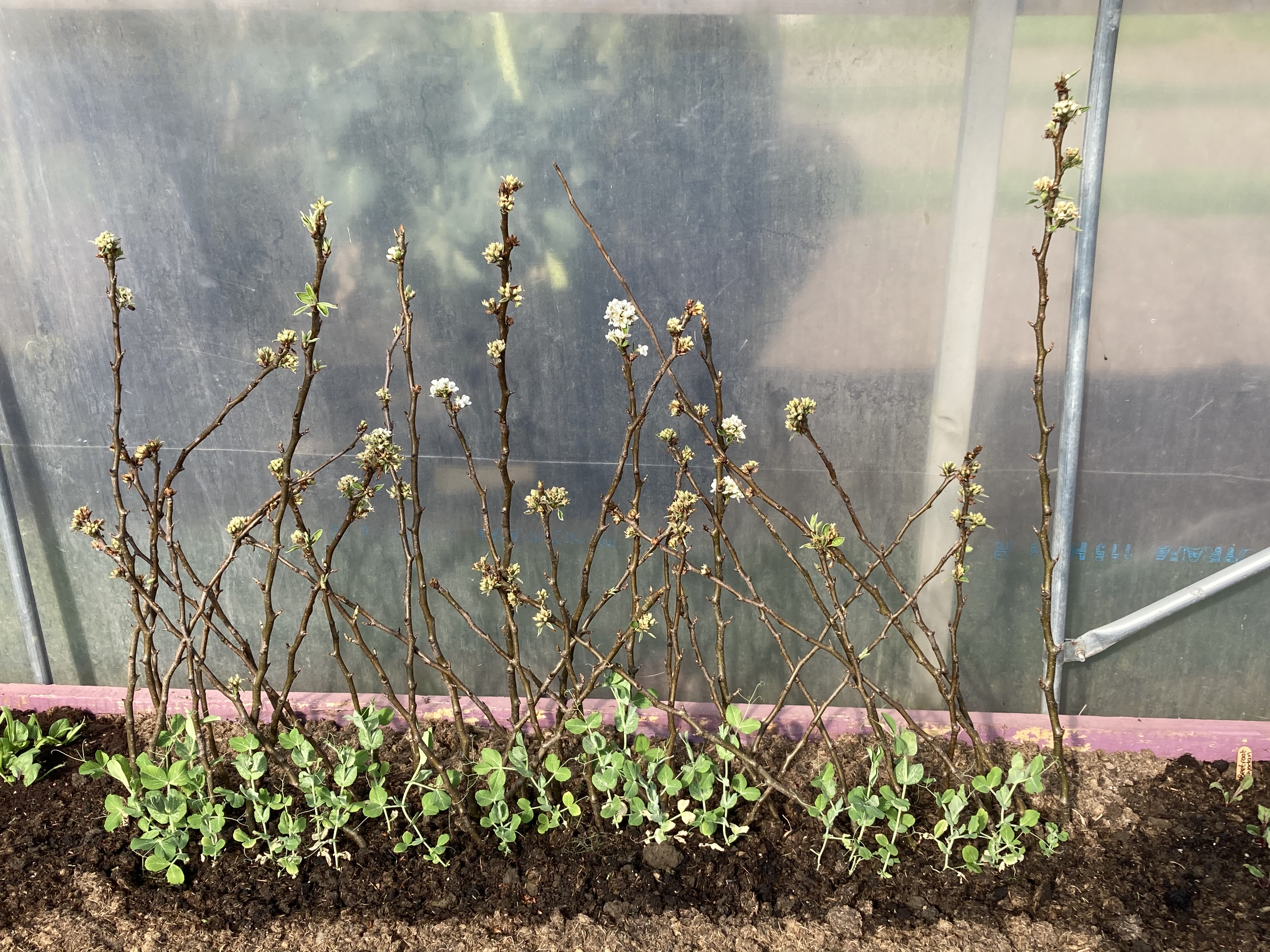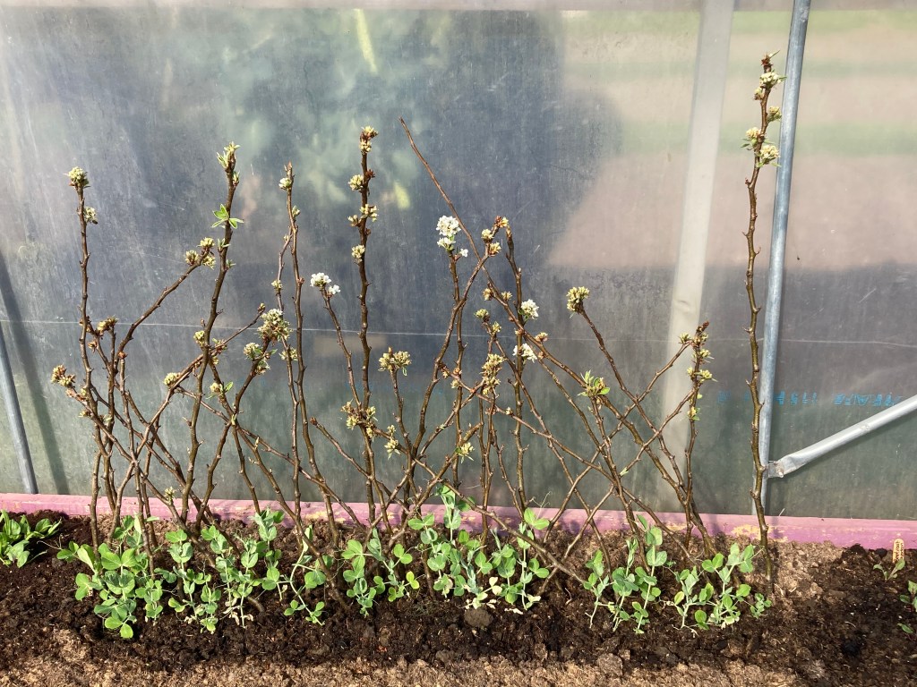 Let’s start with the fruit tree blossom. The cover photo is the conference pear which had a very late (January) pruning. I used the cut branches as support for the peas in the polytunnel about a week later. I didn’t expect the blossom on those branches to continue to open but they have. The rest of the blossom is where I’d expect it to be – still attached to the trees.