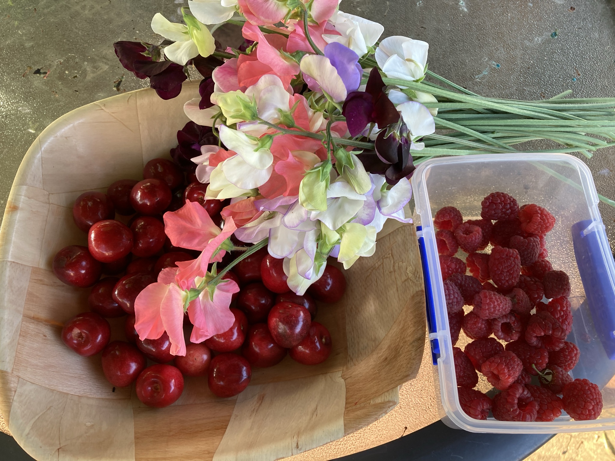 I don’t know the variety, it’s a legacy tree. It is a sweet variety, so best guess would be Stella. I’ve come to an agreement with the birds: they have the fruit high up in the tree and I have everything within reach – it did take a bit of pruning to make I got a fair share!
