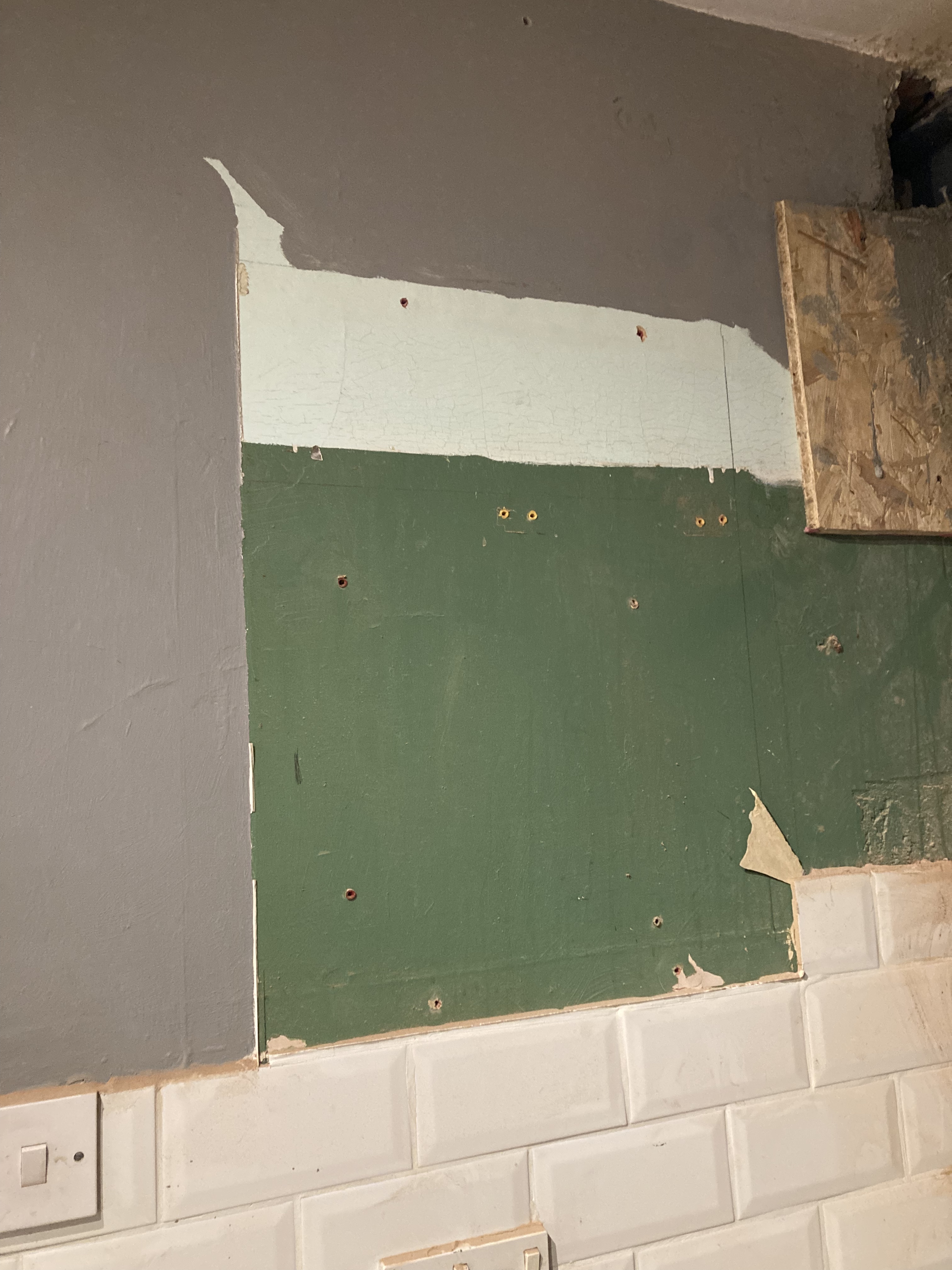 Removing the kitchen cupboards has revealed previous colour choices – there seem to be only three remarkable given the house is 80+ years old. The green is the first, then the aqua and most recent the grey. I’m staying in that colour palette with a pale green.