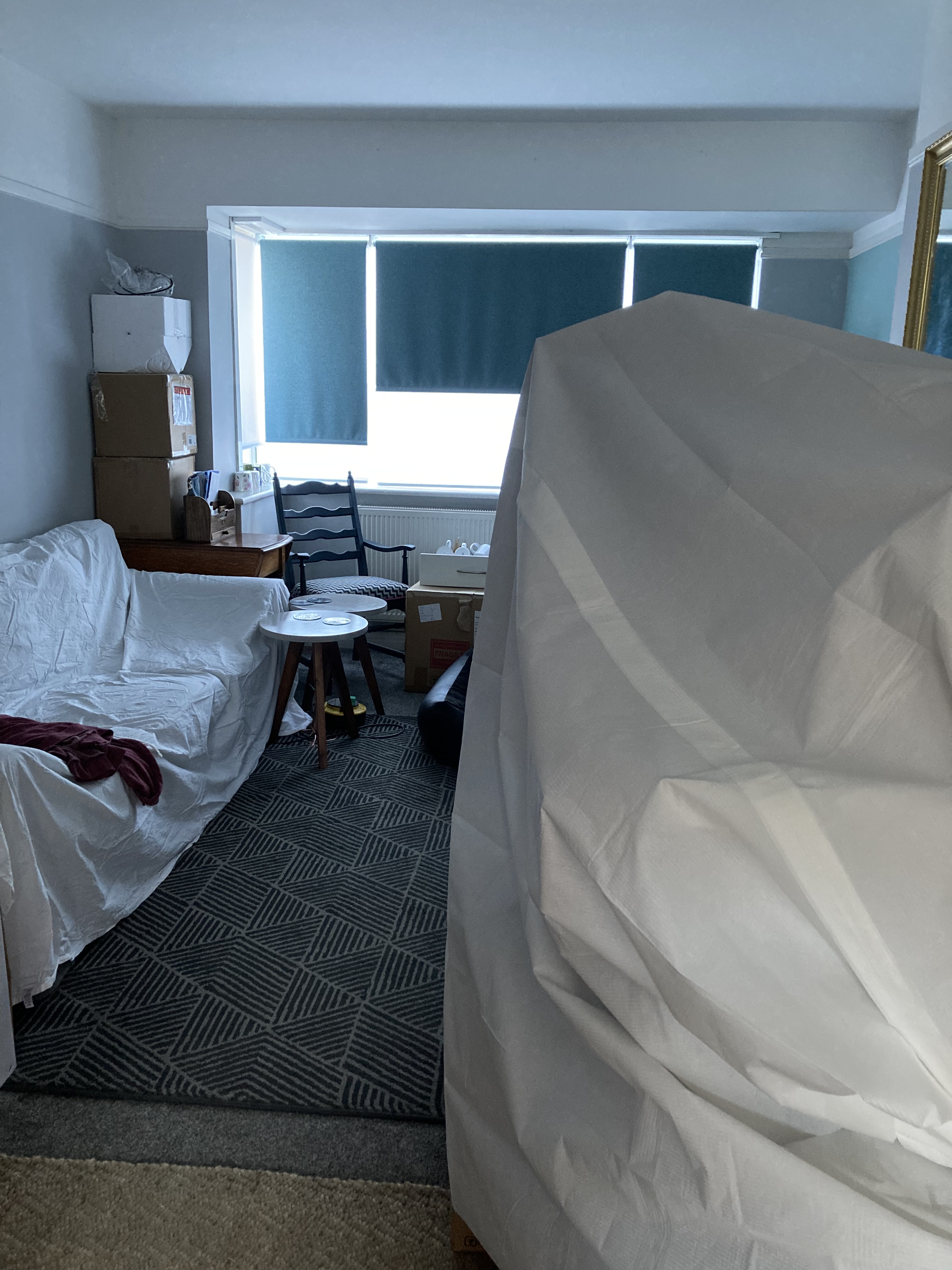 I got ready for demolition by moving furniture into storage (half price for 8 weeks at LoknStore) and covering everything else – there has been a bit of okey kokey going on with chairs and side tables.