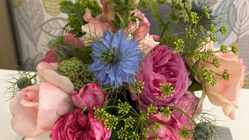 This is the first vase from the plot this year. The roses are Gertrude Jekyll and Chandos Beauty, filled out with alchemilla mollis, flat leaf parsley (gone to seed), nigella, buds of chrysanth macrophyllum and a self-sown antirrinhum