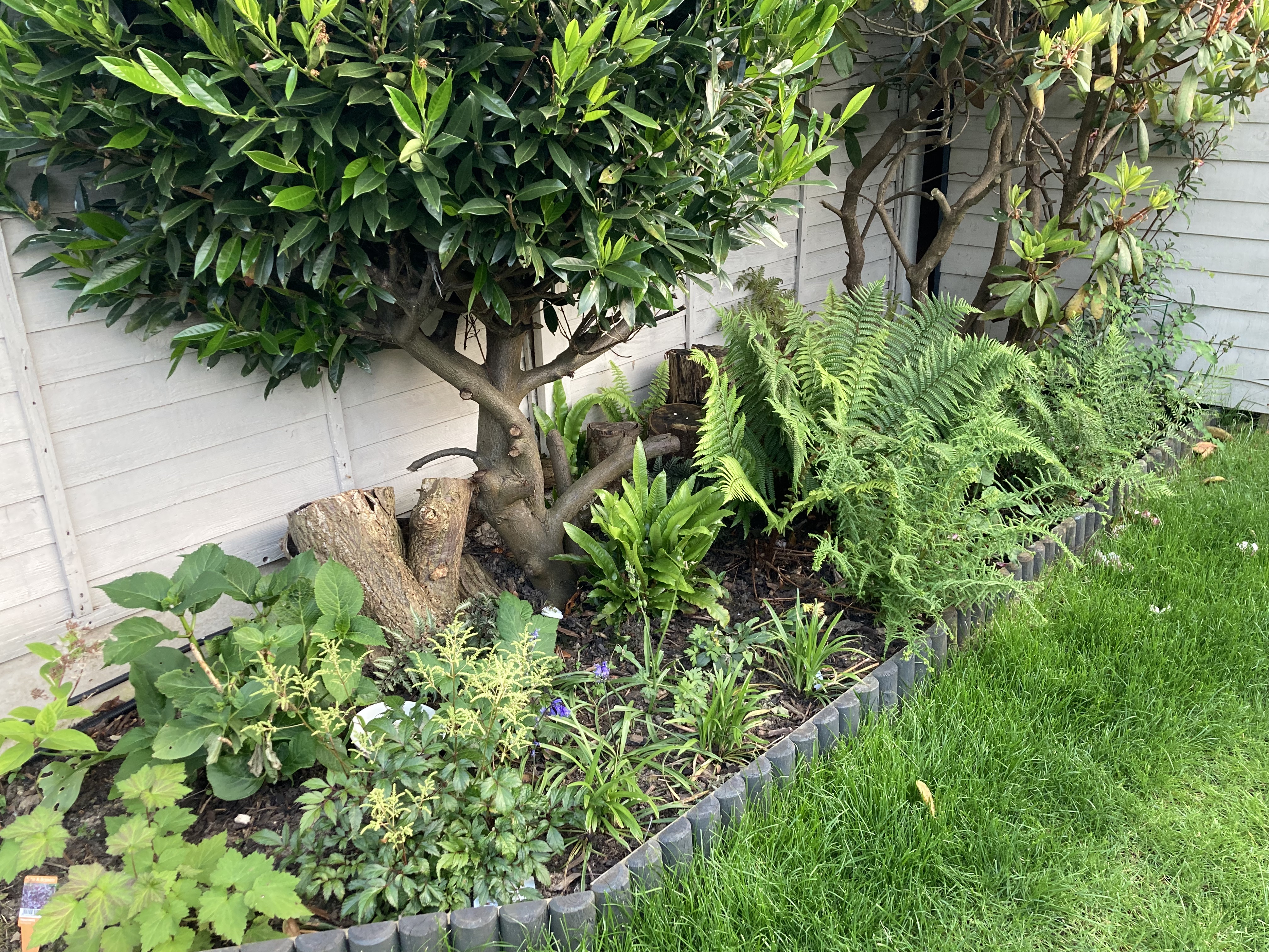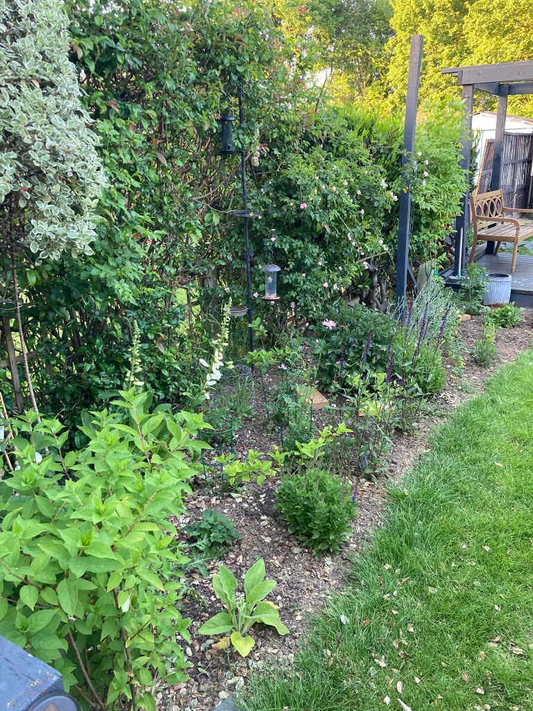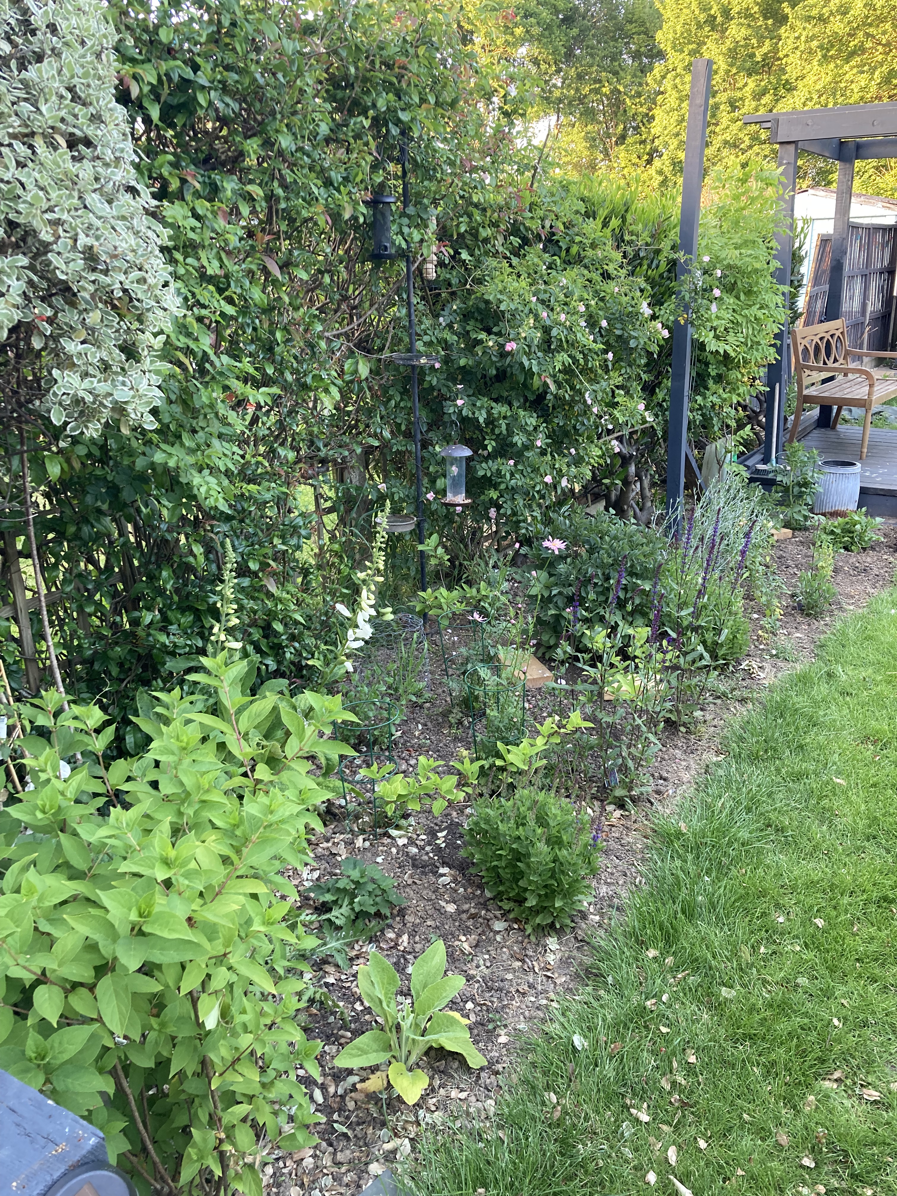 This has really come back to life in the last four months. I’ve always been drawn to flowers but I really enjoy the shapes, textures, and various shades of green in this bed. The bluebells that survived the squirrels appetite are setting seed, so I’m hopeful they like it there and will decide to colonise. The hydrangea has a flower! The lawn has perked up too.