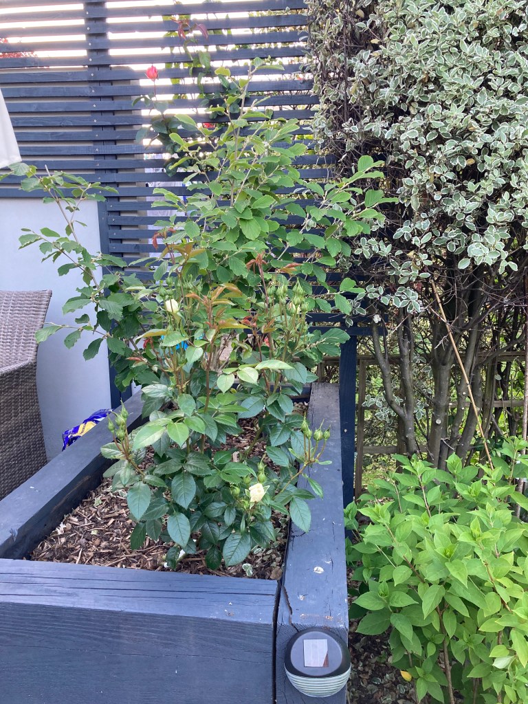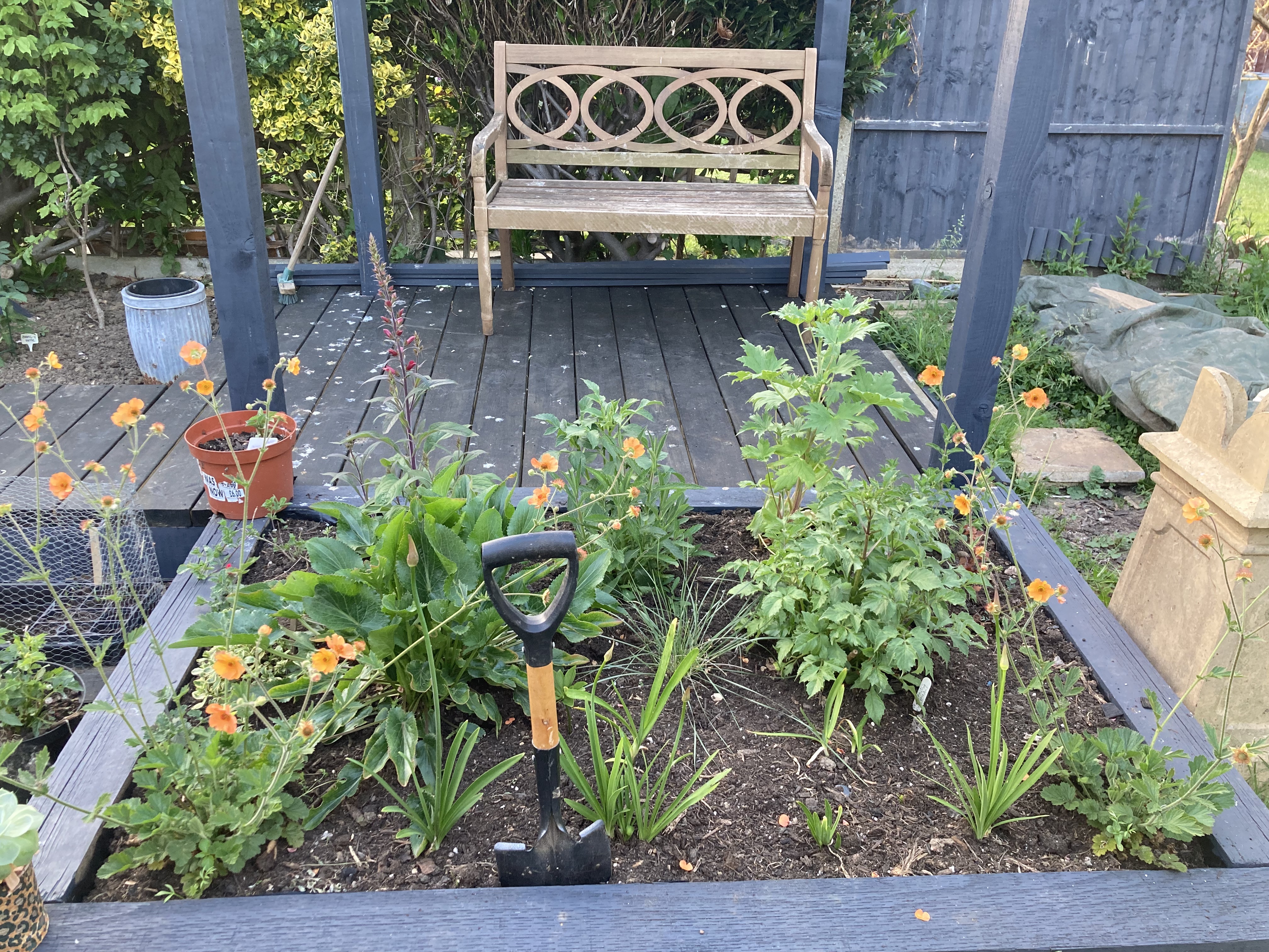 I transplanted both Chandos beauty roses from the plot back in February – you can see one in front and to the right of the valerian. The leafless holly joined the gang in April and promptly dropped it leaves – no idea why. The cold weather wiped out the Molly penstemon and for the first time in about 20 years, I no longer have a tall white penstemon in the garden or a pot or propagating in a shady corner. I feel sad. On a brighter note, the local garden centre is pleased I’ve moved to the area. I’ve added a lilac (far top left) and just out of shot (middle left edge) a sambucus black lace.