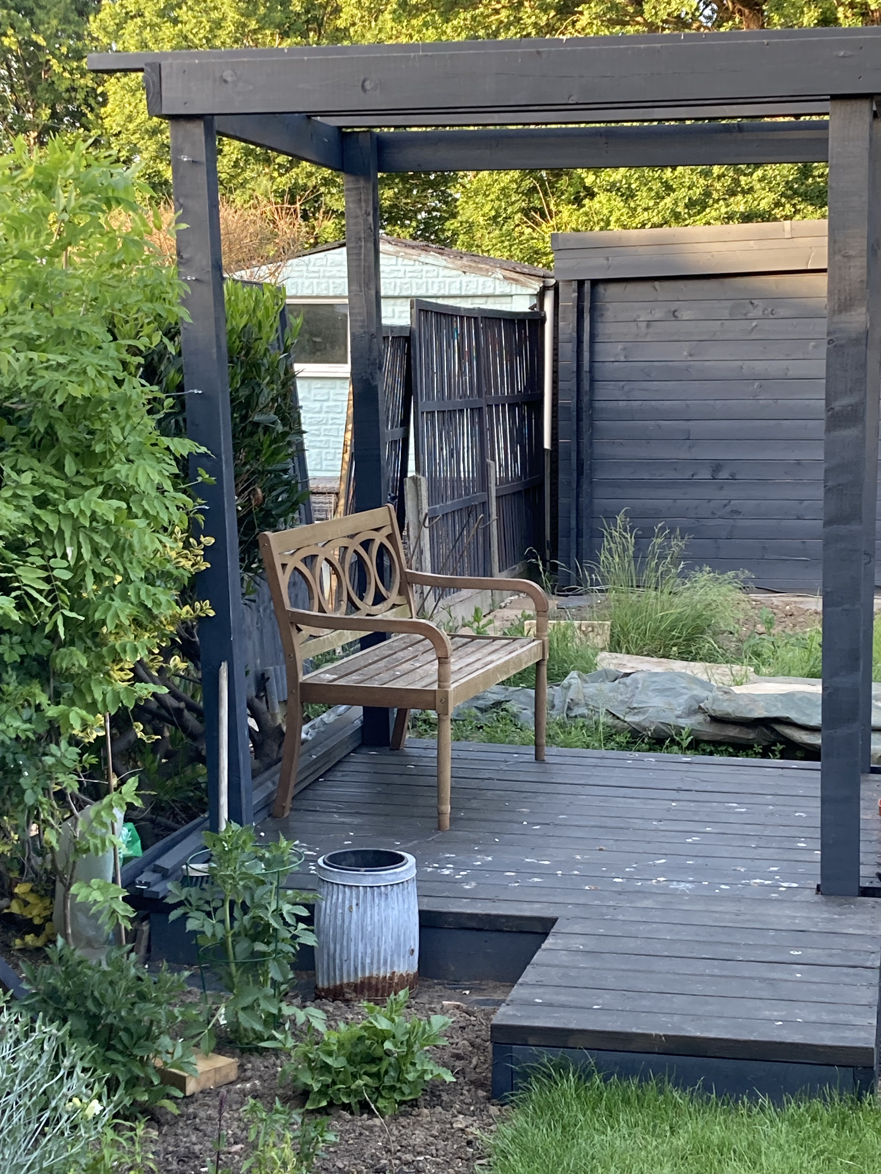 This was still at the planning stage back in February and now it’s finished. The long term plan is to have the wisteria growing elegantly across it; while we wait the pigeons are using it as their poo perch which makes sitting in that spot less appealing than I had hoped. On order are pigeon spikes and a sun canopy that will likely double as a poop catcher.