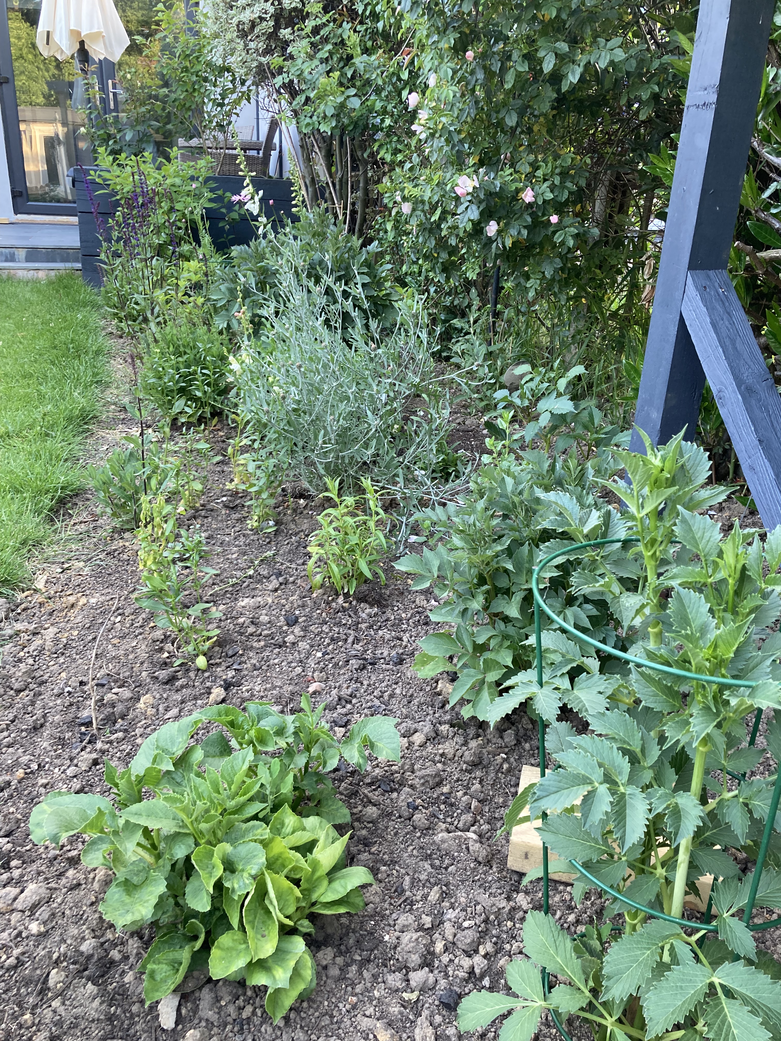 This is filling out nicely. I planted the plot dahlias in this bed a few weeks ago and although they are growing, they are not growing at the rate they have done at the plot. Maybe they want to go home as well! In the second shot behind the dahlias are some seed grown antirrhinums, apple blossom who are definitely not happy with their accommodation – I’m making regular offerings of liquid feed. On the upside, the hydrangeas, foxgloves, salvias, and pyrethrum are all doing well.