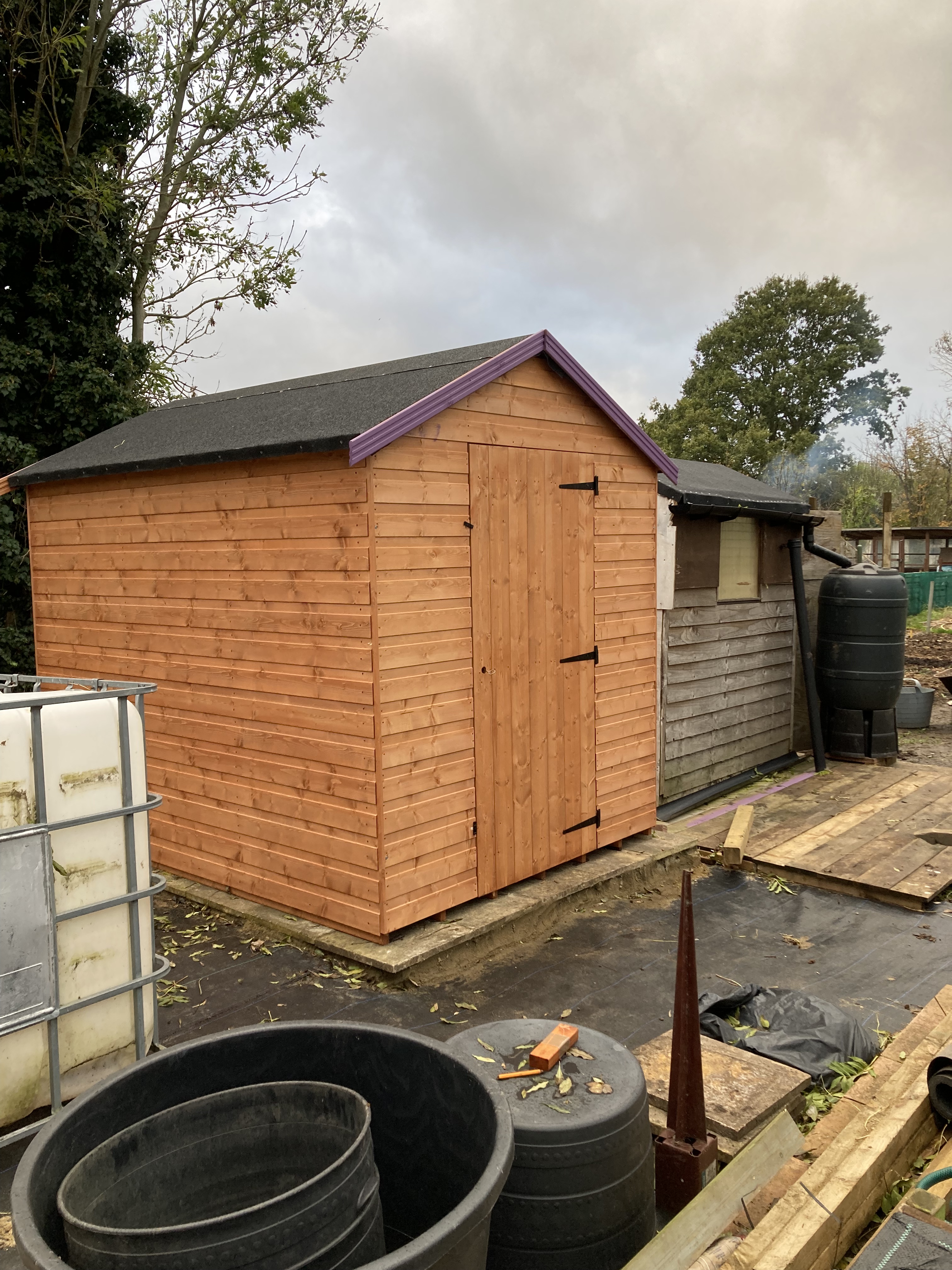 I found Tiger Sheds who offered a 8×6 shiplap timber shed at a very good price – when compared to the last couple of years. It arrived in it’s full orange glory, the delivery guy helped to carry every panel to the plot then me and the boys assembled, which went very smoothly once we’d figured out how to remove the blocks added for transport. It looks very smart and very conspicuous in it’s orangeness. I think the grey helps it blend into its surroundings.