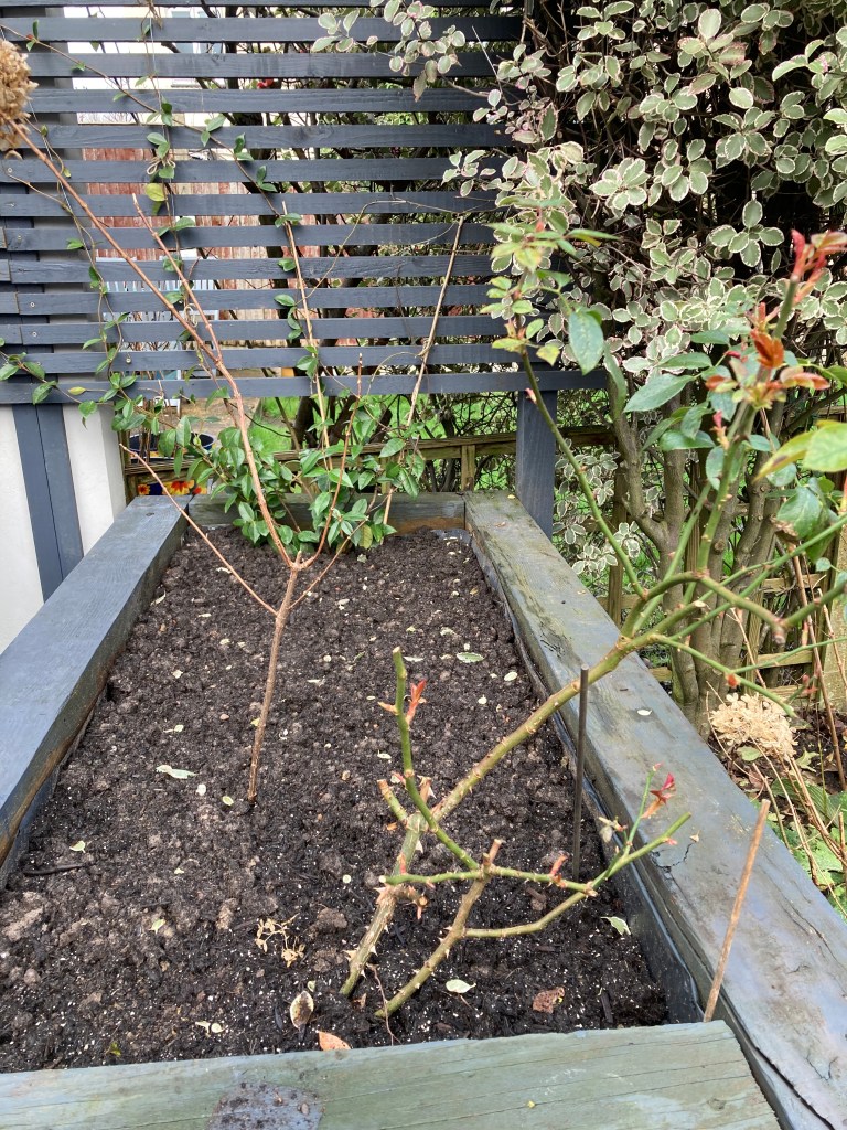 2. Sarcophagus bed – topped up with soil and compost. The jasmine trachelospermum is looking much happier. I re-homed the hydrangea (one of the lost label cohort) and have a climbing rose ‘Heaven scent’ to add. No idea why floribunda Champagne has decided to grow at an angle.