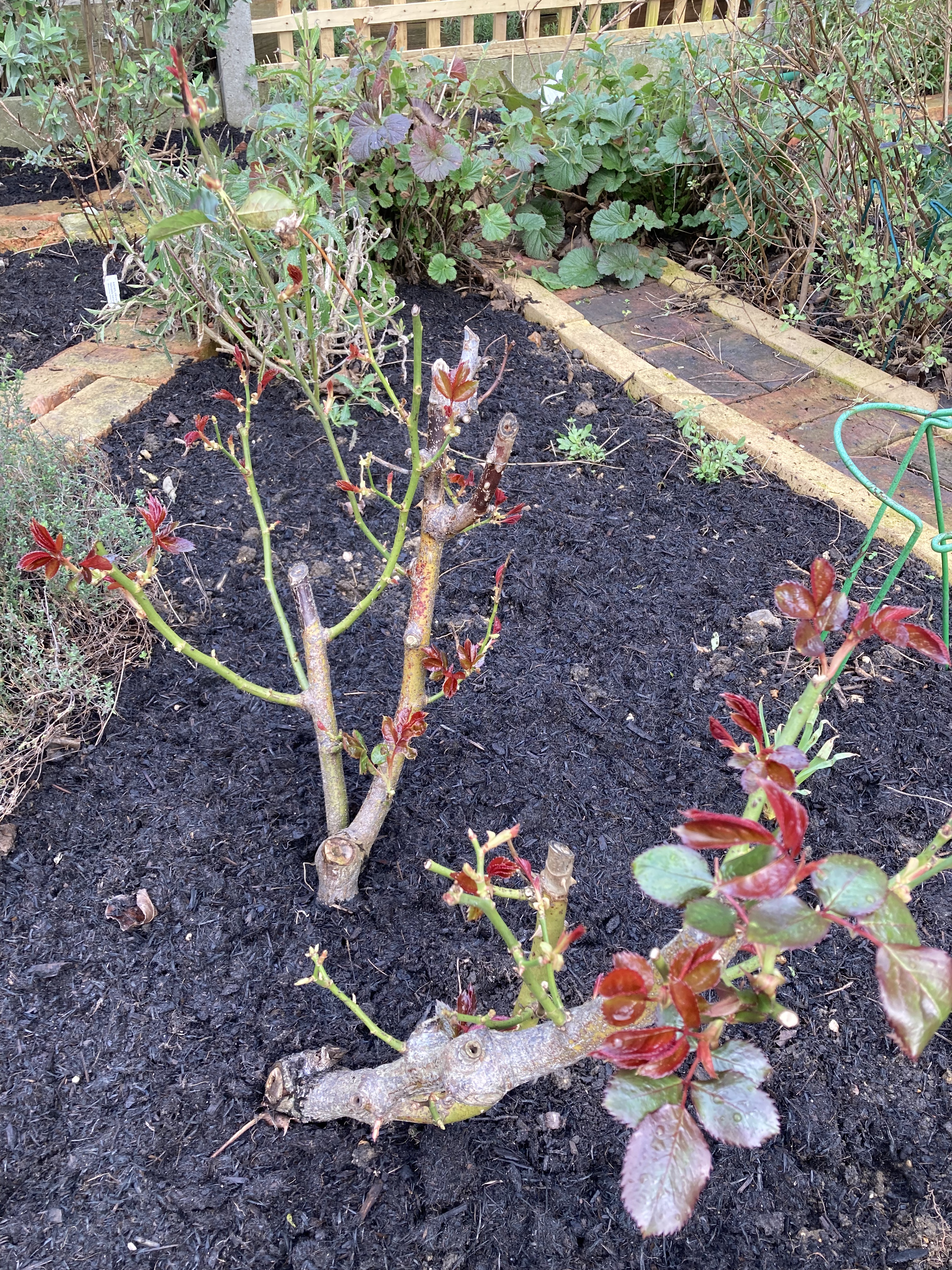 5. Chandos Beauty rose – The original plan was to call time on the two bushes I’d transplanted into the front garden from the plot last year. The afternoon sun seemed too hot for them and both bushes looked miserable. I purchased two shrub roses, reputed to be much tougher ‘Charles Austin’ to replace them. When I lifted one of the beauties, I noticed strong growth from the main stems so have re-thought the plan. One is in the south herbaceous border where it will get sun for most of the day and I have the other in situ in the front to monitor progress this year. I’m holding off pruning for a few more weeks. The Charles Austin shrub roses are currently in pots and will go in the front garden next week.