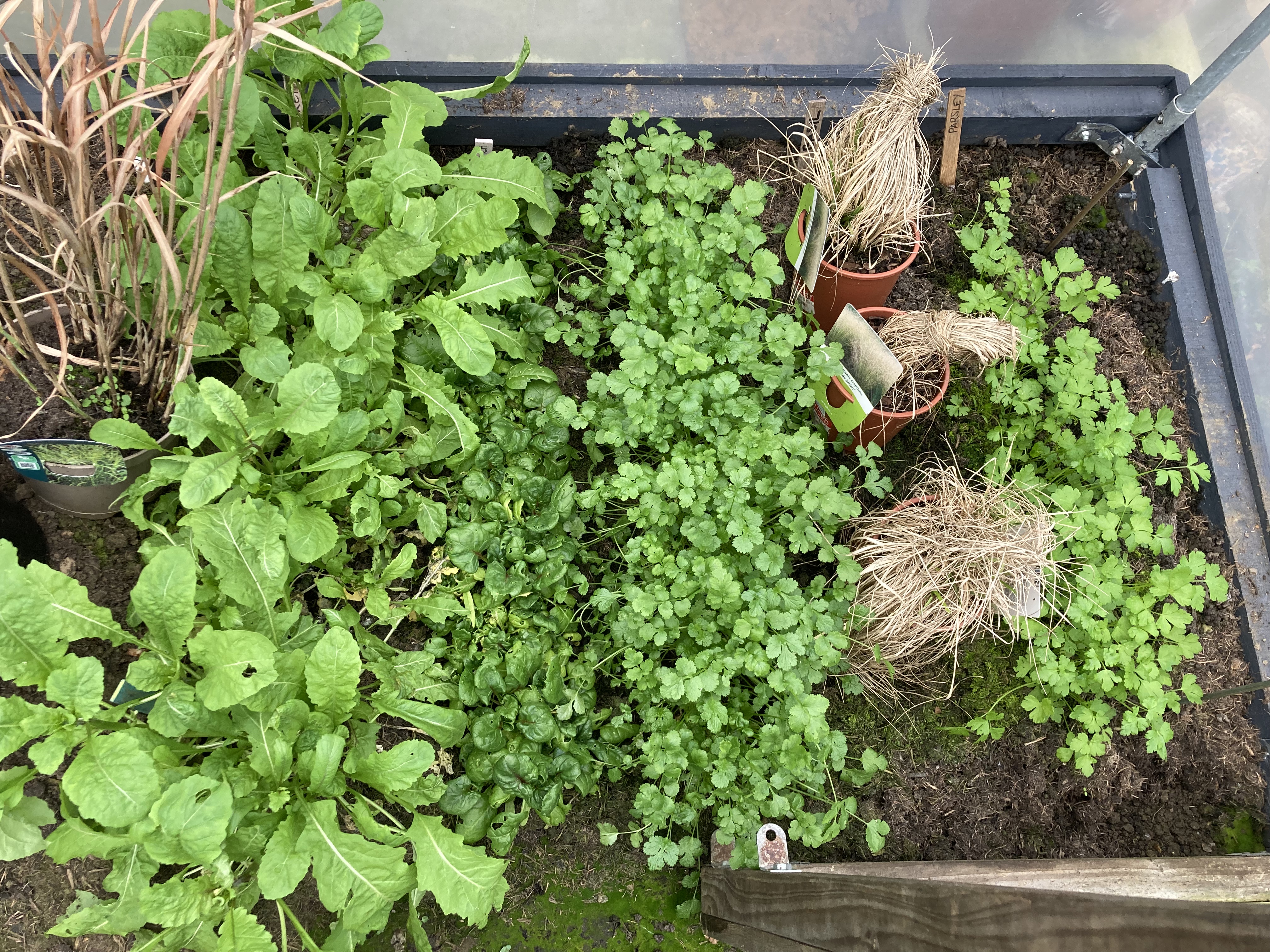 I’m still organising the growing spaces, this being the first full year of home garden production. I sowed parsley, coriander, spinach and rocket in October and they are revving up growth. Excuse the garden centre bargains waiting to be planted out.