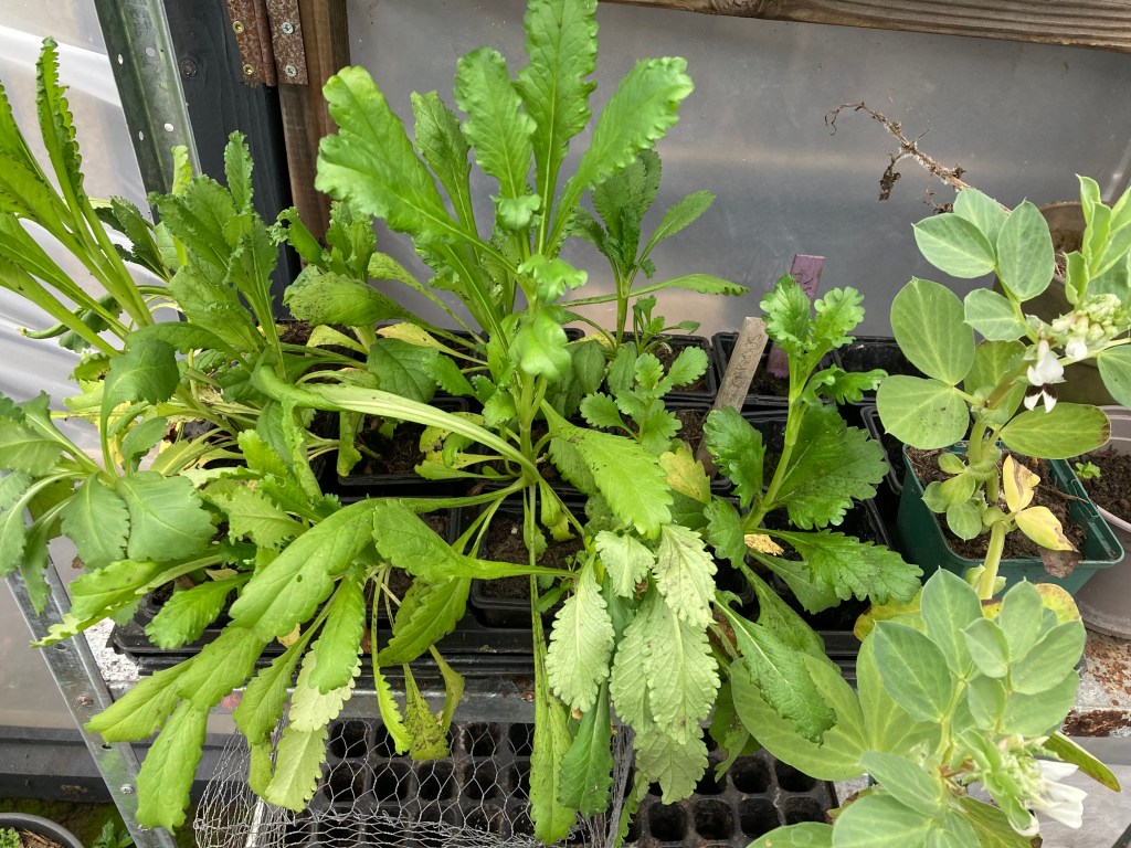 The scabious is impatient to move outside; the lone broad bean is also keen to get its roots settled.