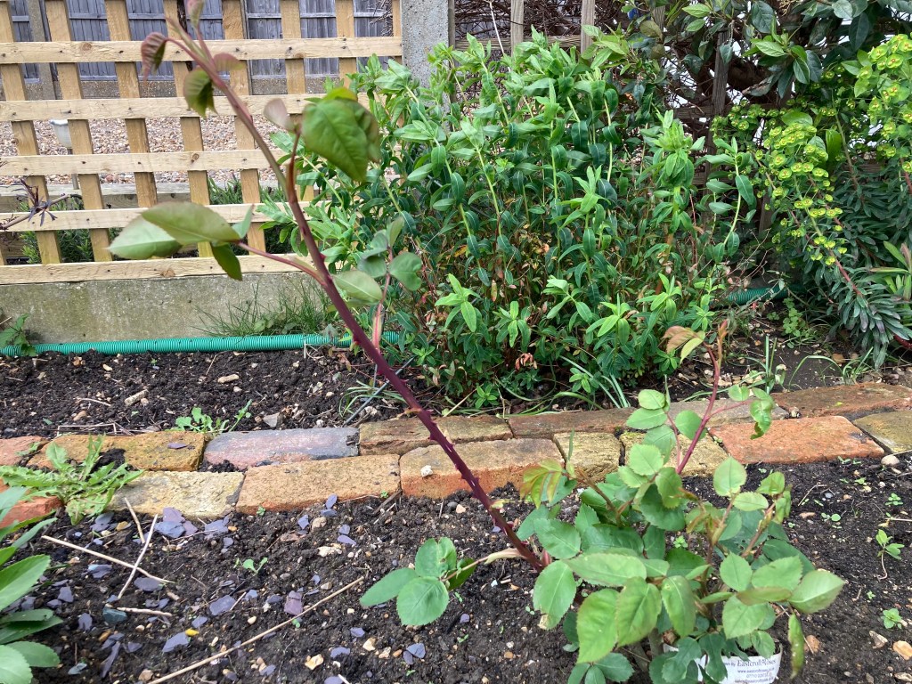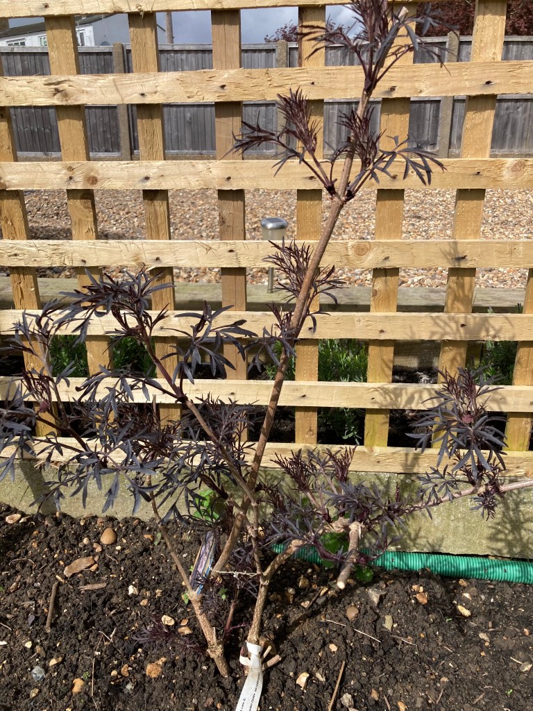 3. Sambucus nigra ‘Black Lace’ This did well last year. One branch had a growth spurt, I’ve trimmed it back a little, hoping the rest will catch up, otherwise there will be more trimming.