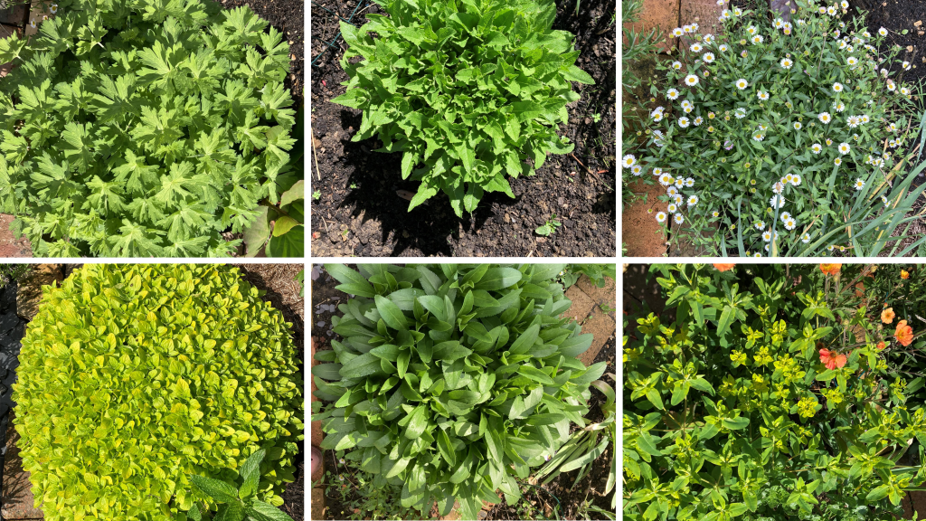 Let’s start with the top row, from the left is Geranium Rozanne, then Salvia Nemorosa followed by Erigeron Karvinskianus, grown from seed.