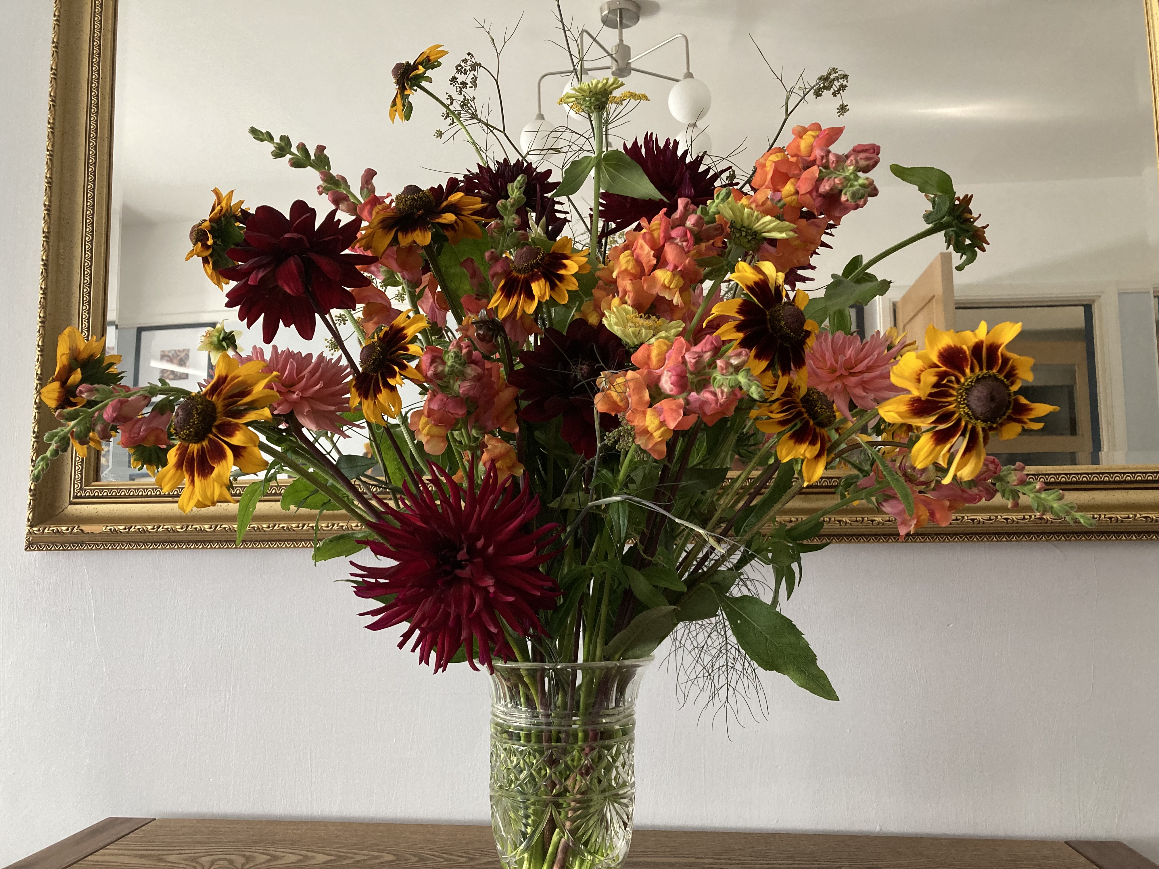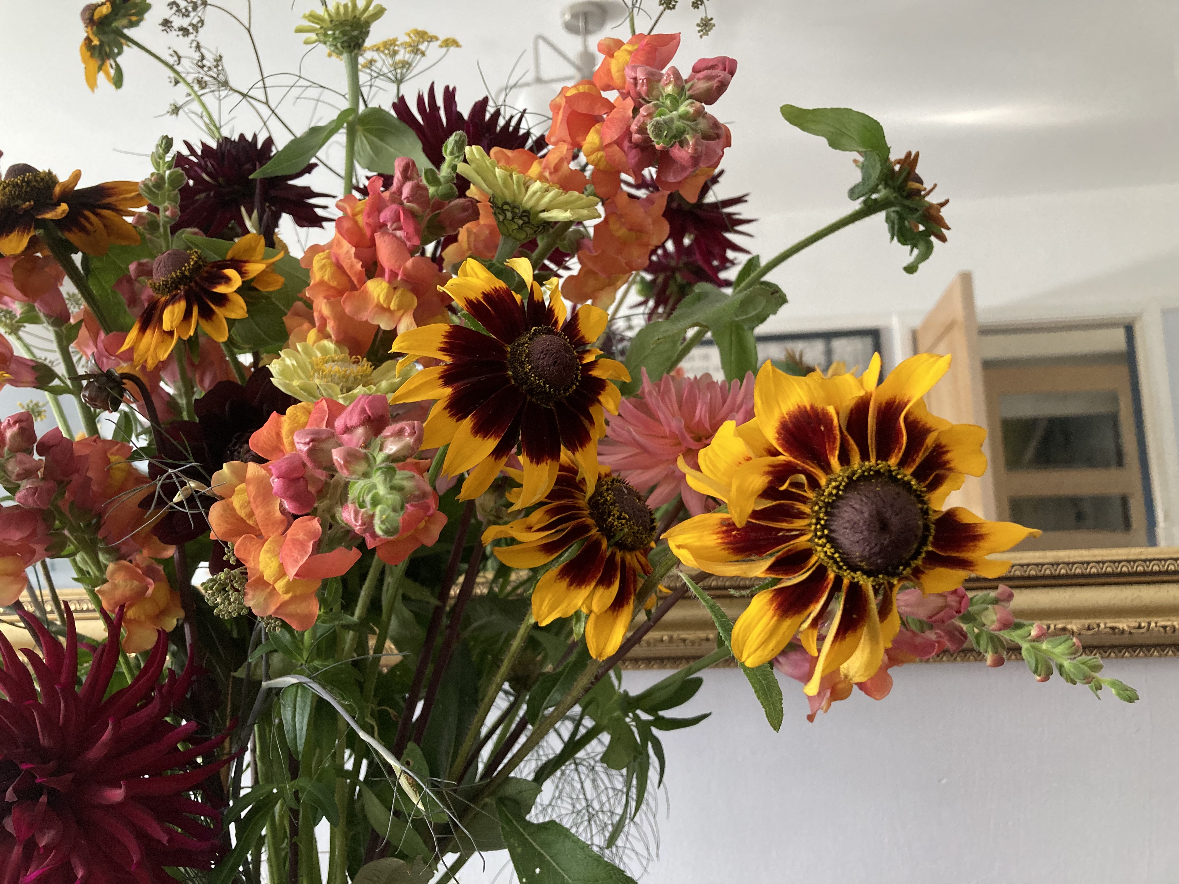 Oh what a bountiful vase, Sharon, and those ‘free’ rudbeckias are such a great colour! I had no success with Prairie Glow this year, but these blooms look much bigger than PG. I am trying to establish my favourite antirrinums for future years, and your ‘orange’ ones certainly make a subtle impact – great to have a second flush this year, as my white ones are doing too.