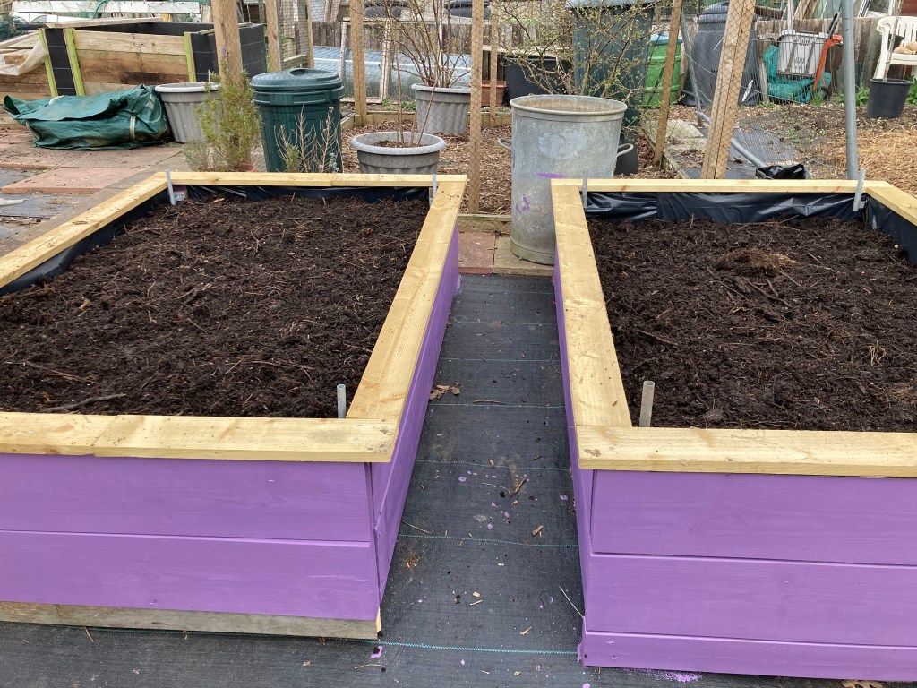 I’ve added two double-height raised beds to the plot. This is the end that was previously the unofficial dumping and bonfire site. I covered the whole area with weed membrane and located the blueberry cage, shed and compost bins plus large pots for carrots. That left a space just the right shape and size for two 6×4 beds. Double-height to give sufficient space for root growth but that is about a cubic tonne of soil each. I’ve taken a hugelkultur approach and filled the bottom third with wood chips, then a layer of fresh manure and topped up with compost that’s been cooking for about 9 months. Now I need to be patient and allow those layers to get to know each other and settle before adding a layer of purchased top soil. I’ll sow seeds this week – spring onions, beetroots, lettuce etc and plan to have the bed ready for them to be planted out in May.