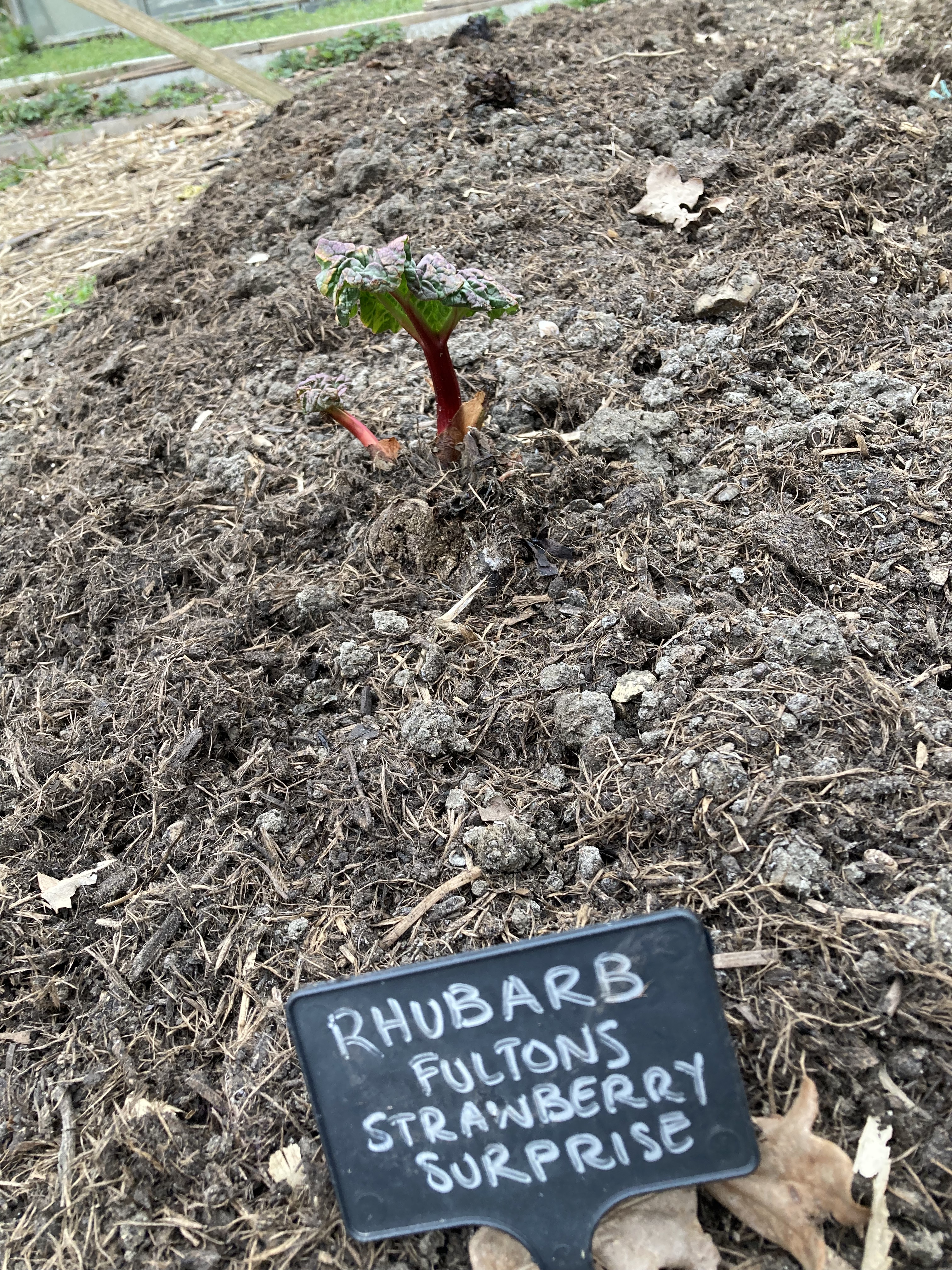 Impatience loves action. In this case that meant purchasing 3 new rhubarb rhizomes. T&M wanted £20 per pot!!! so back to Google I went and discovered Otter Farm who had 3 x Fulton’s strawberry surprise in stock for £20 – much more sensible. I’ve placed these on the opposite side of the plot, where it is less soggy in winter but in full sun during the summer. Lots of compost has been dug in and a good sprinkling of lime to ensure red stems. If sprouting continues, I’ll have seven rhubarb crowns – that’s a lot of compote.