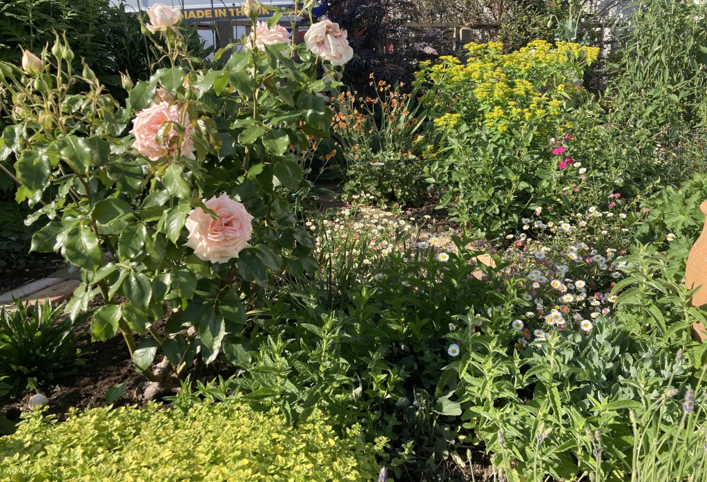 Here’s an overview of progress in the front. I’m super pleased that Chandos Beauty has settled in and the two shrub roses Charles Austin are also doing well.