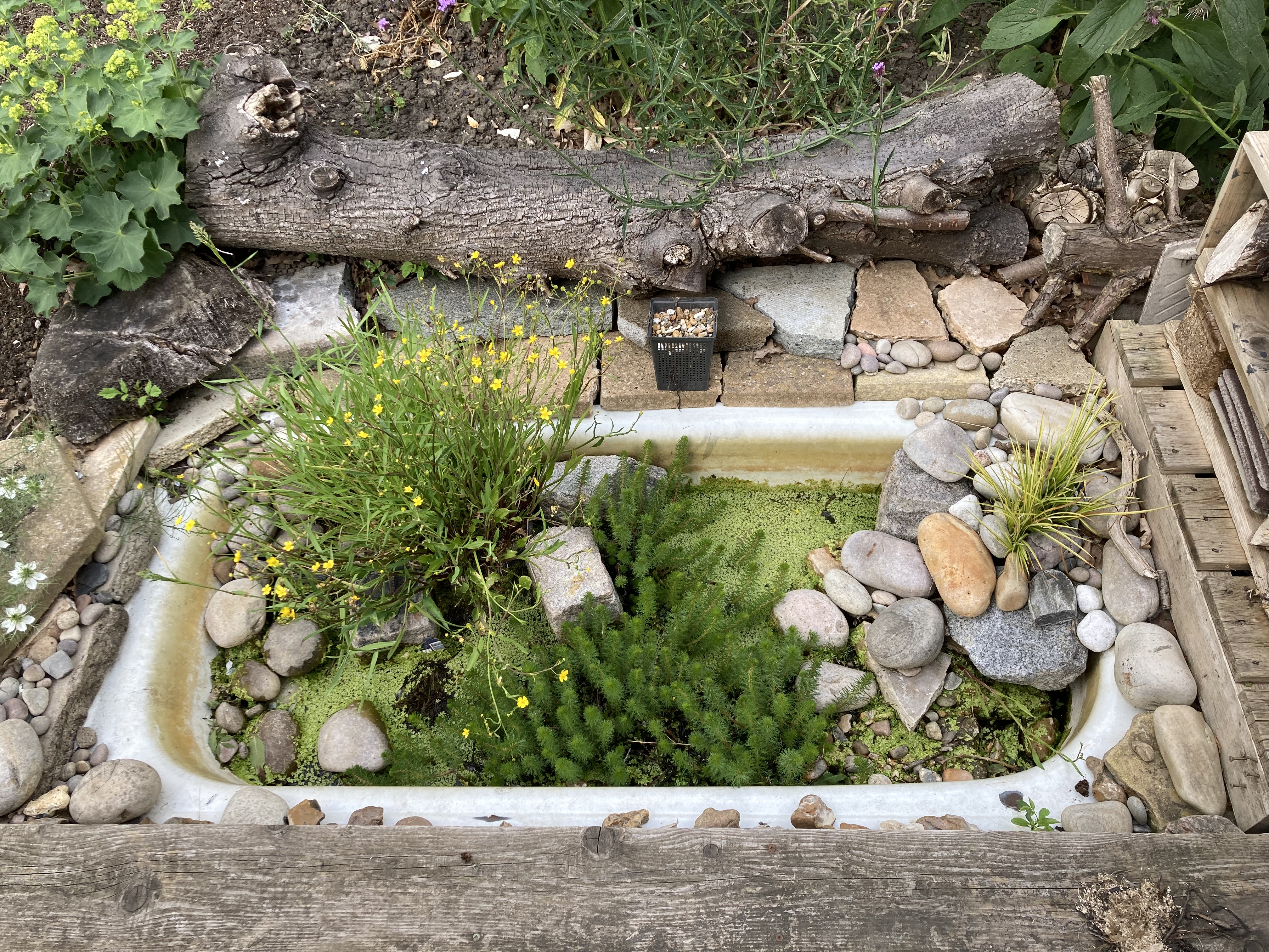 The bath pond has settled into semi neglect. The aquatic grasses didn’t make it through the winter and I’ve accepted duck weed as a feature.