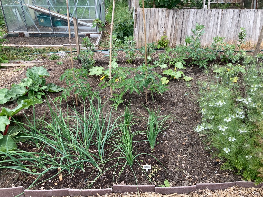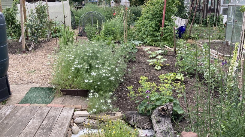What I call the main veg bed has broad beans (black fly fodder) courgettes, bush tomatoes, onions and shallots. When the self-sown nigella has finished, I’ll pull that to make way for the fennel plants.