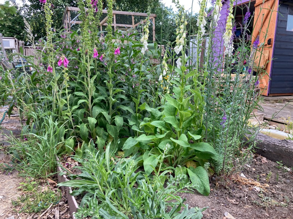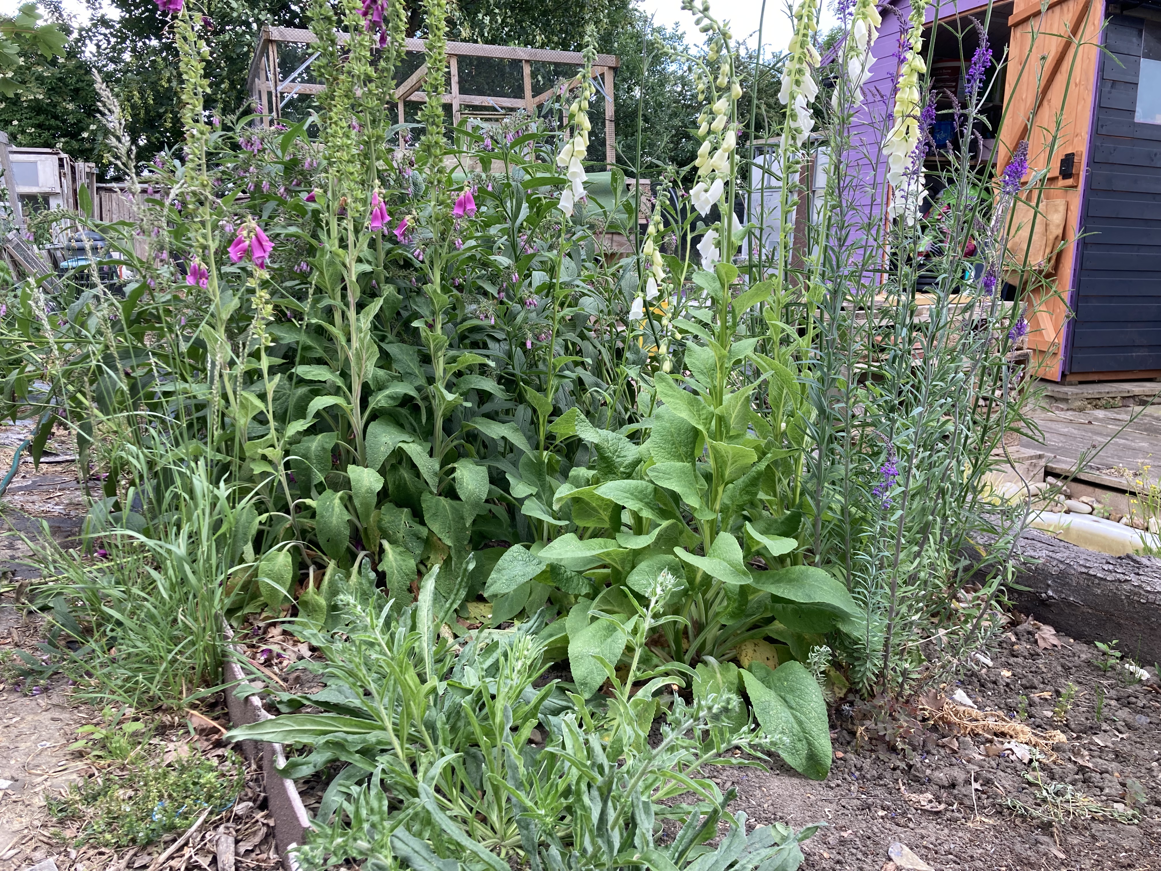 The wildflower corner is by the bath pond and next to the compost bins. The various spires are pleasing.
