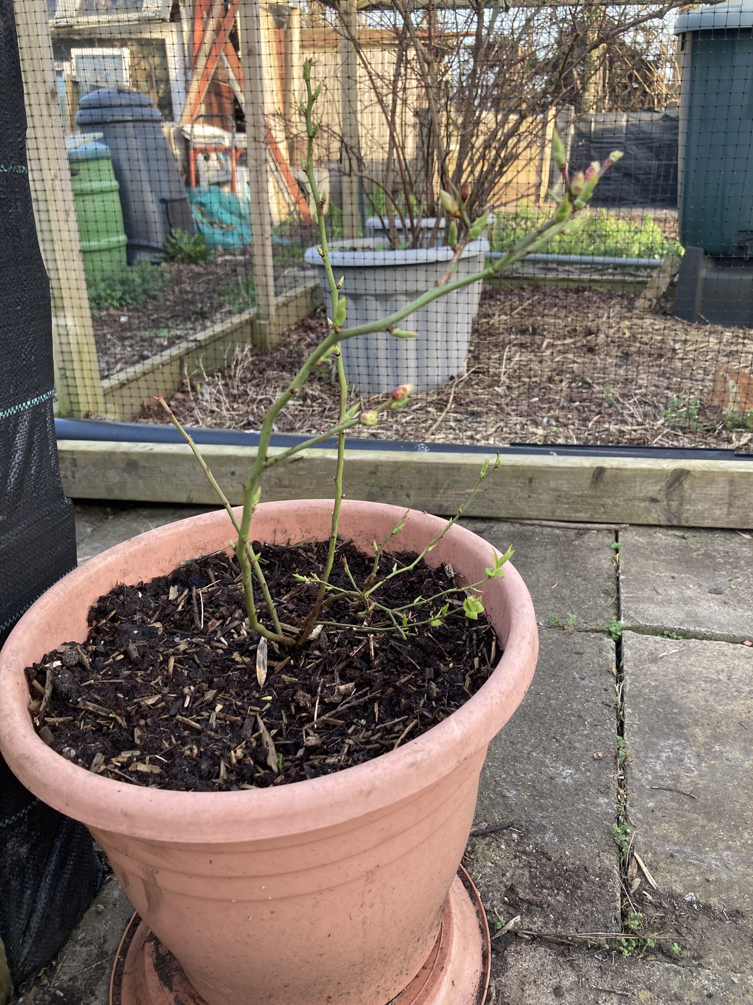 This blueberry bush is the same age as the larger bushes in the background, but it has struggled to thrive. I moved it to a smaller pot with fresh ericaceous compost and sieved bark and it’s off like a rocket. Like most things, it just needed the right conditions to thrive.