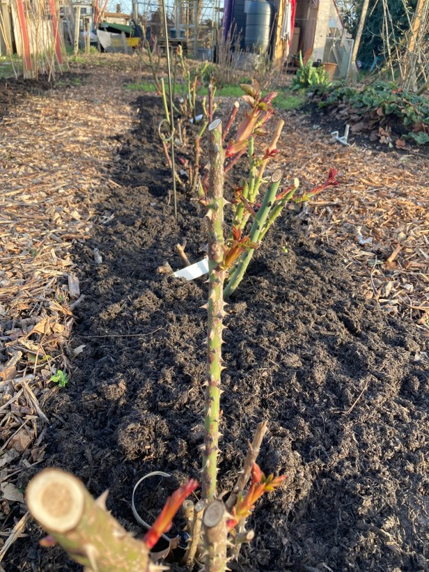 The rose row looks healthy with a deep compost mulch. There’s promise of several Monday vase displays.