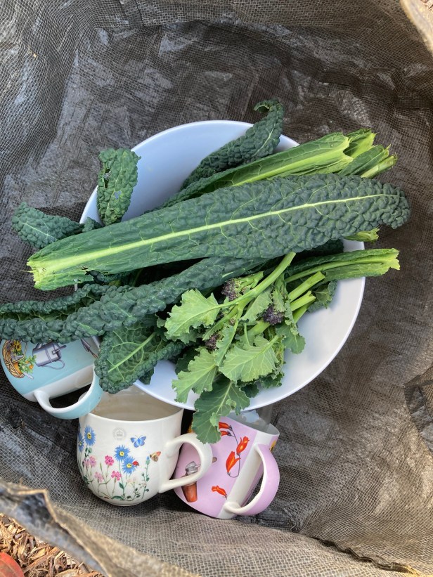 I’ve been picking cavolo nero kale for months but this is the last as the plants are going to seed. Joining the bowl is purple sprouting broccoli – only two plants survived and are only a third of their usual height so I suspect the season will be short. I’m sowing peas in the greenhouse to go into the PSB bed in early April.