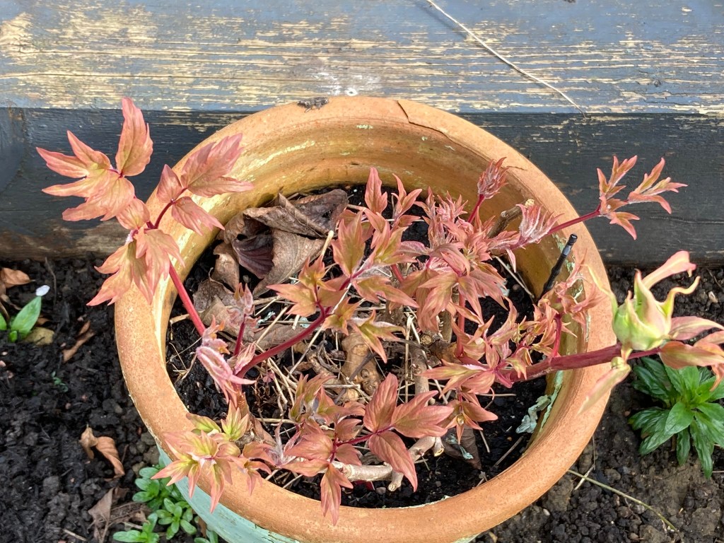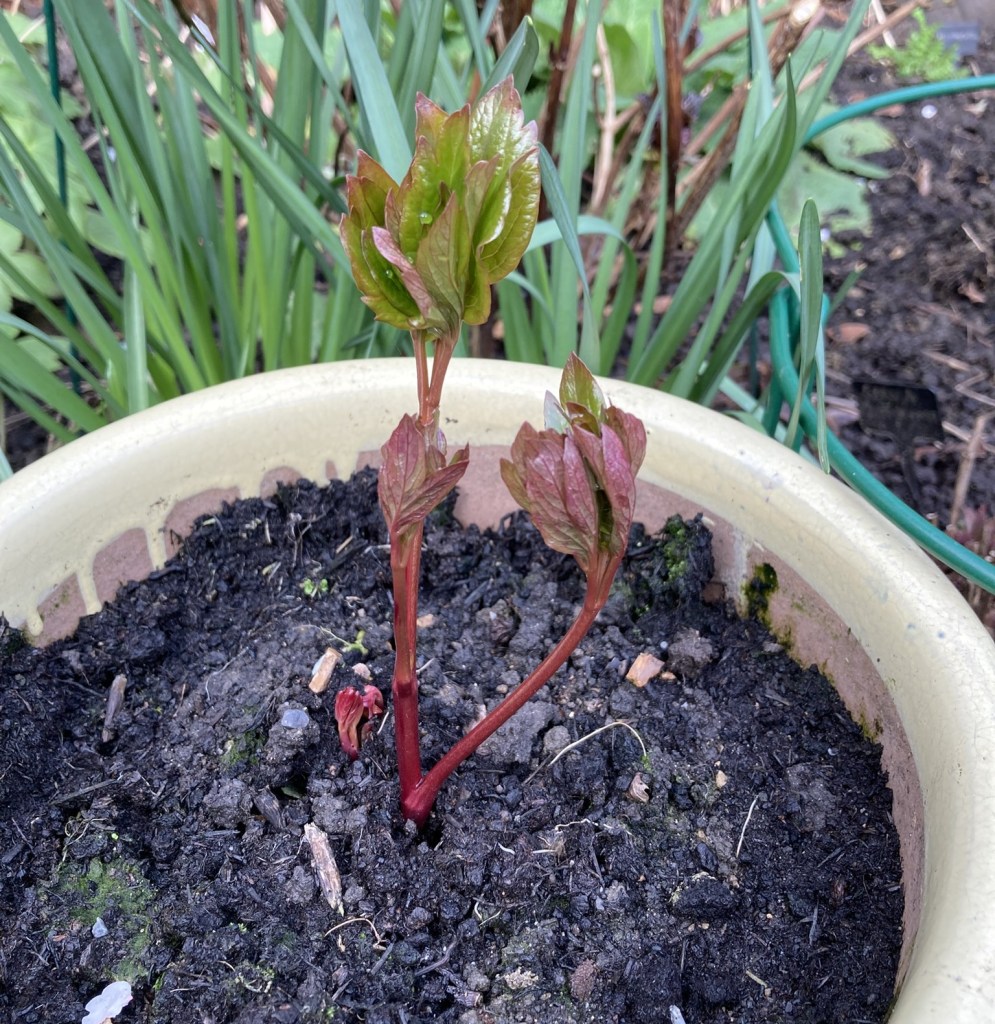 2. Peonies – The rescue tree peony has produced its annual bud. I did promise it a new pot and fresh compost – I’ll get to that this year. In the yellow pot, I think is Coral Charm. I don’t expect that to flower for a few more years.