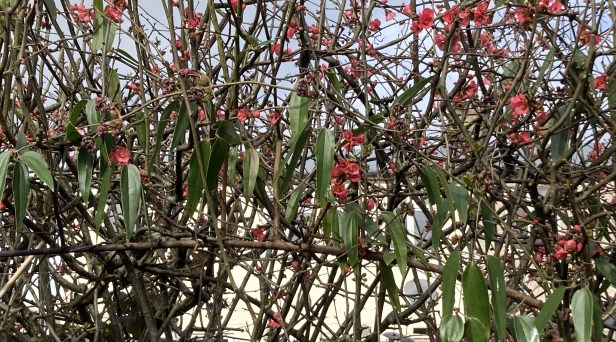 3. Flowering hedge – the Japanese quince continues to send out suckers and I continue to slice or dig them out. This is the time of year when I can forgive its thugish behaviour. Intermingling is Clematis armandii Appleblossom; look closely and you will see clusters of buds.