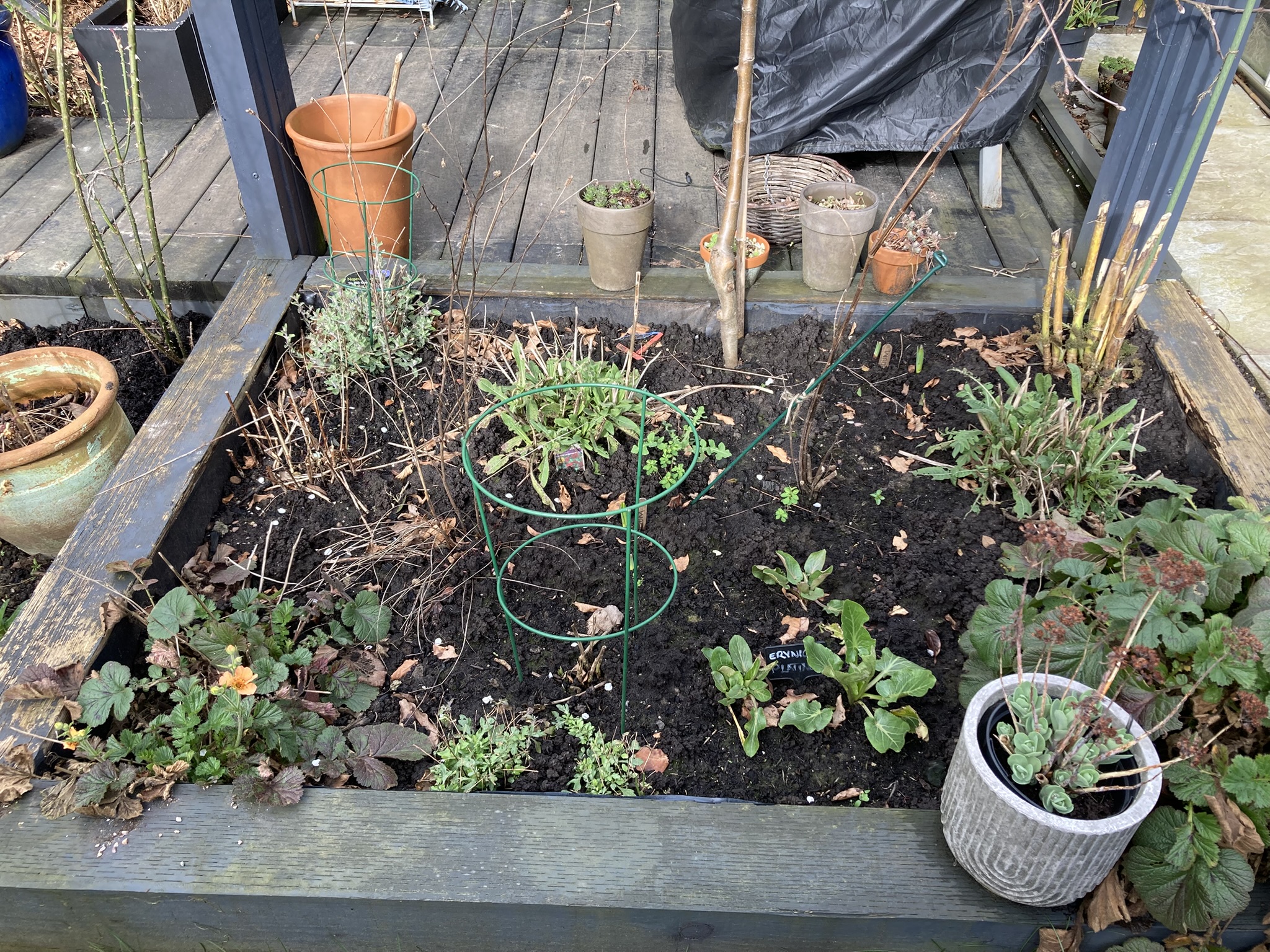 4. Pergola bed – I edited this bed in November. The newly planted alliums are just pushing through the soil. I was surprised to see the geums in flower, but they know best.