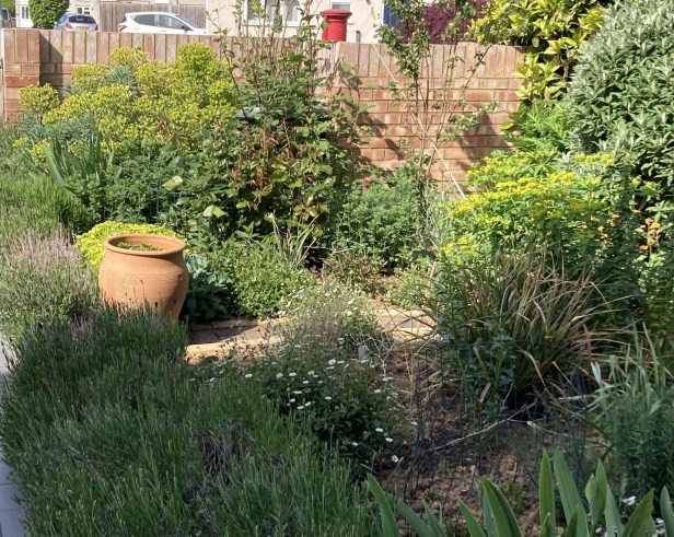6. View from the front door – I’m very pleased with this. The euphorbia wulfenii is in overdrive as is the shrub rose Charles Austin and obsuring the grey pot containing the magnolia that has just finished flowering.